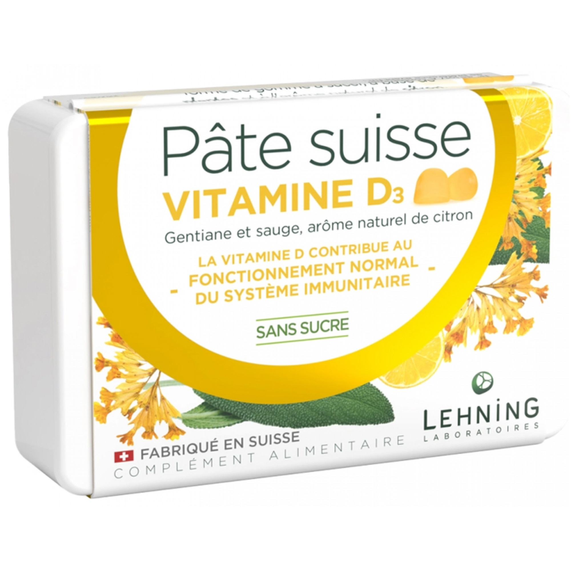 Cette pâte suisse a été formulée pour que la prise de vitamine D3 devienne un plaisir et non une contrainte grâce à son arôme naturel de citron, équilibré entre douceur et acidité. Idéalement dosée pour convenir aussi bien à l'adulte qu'à l'enfant, chaque gomme contient 10 microgrammes de Vitamine D3 soit 200% des apports journaliers recommandés ou 400 UI. La vitamine D et la sauge contribuent au fonctionnement normal du système immunitaire. La gentiane a un effet tonifiant. Facile à glisser dans une poche, cette boîte de 40 gommes sans sucre peut s'emporter partout. L'arôme naturel de citron apporte à la fois douceur et acidité, pour une prise de vitamine D facilitée et avec plaisir.