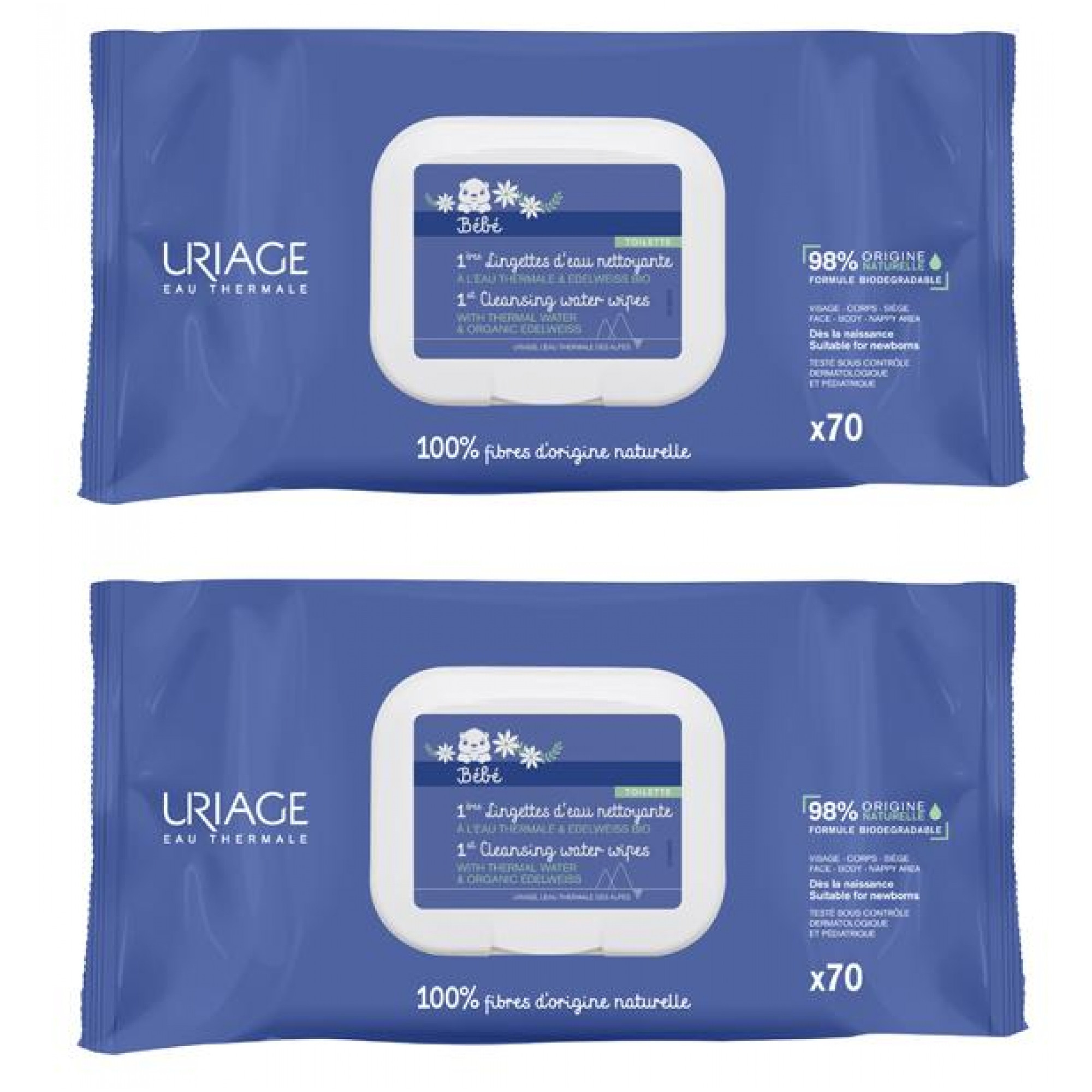 Lingettes nettoyantes pour bébé Uriage 1ères Lingettes d'Eau - Lot de 2 x 70 Lingettes