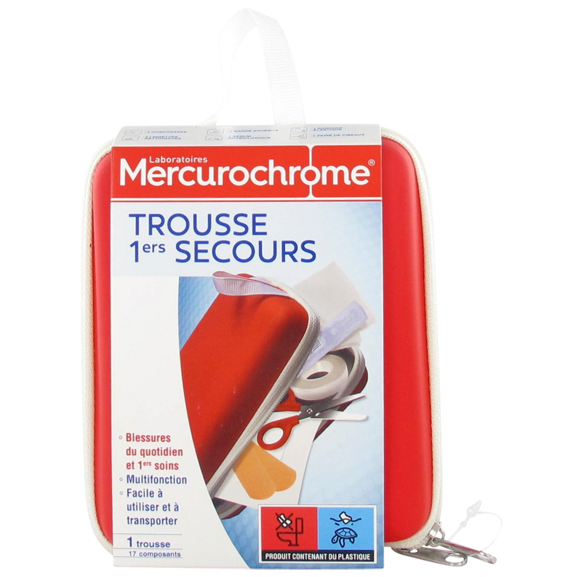 Découvrez la trousse 1ers secours Mercurochrome, elle contient les produits indispensables pour les premiers soins et blessures du quotidien. A la maison ou en extérieur, son contenu facile à utiliser vous permettra de subvenir aux petits accidents du quotidien. Sa trousse maniable et légère est idéale pour vos voyages et activités de plein air.