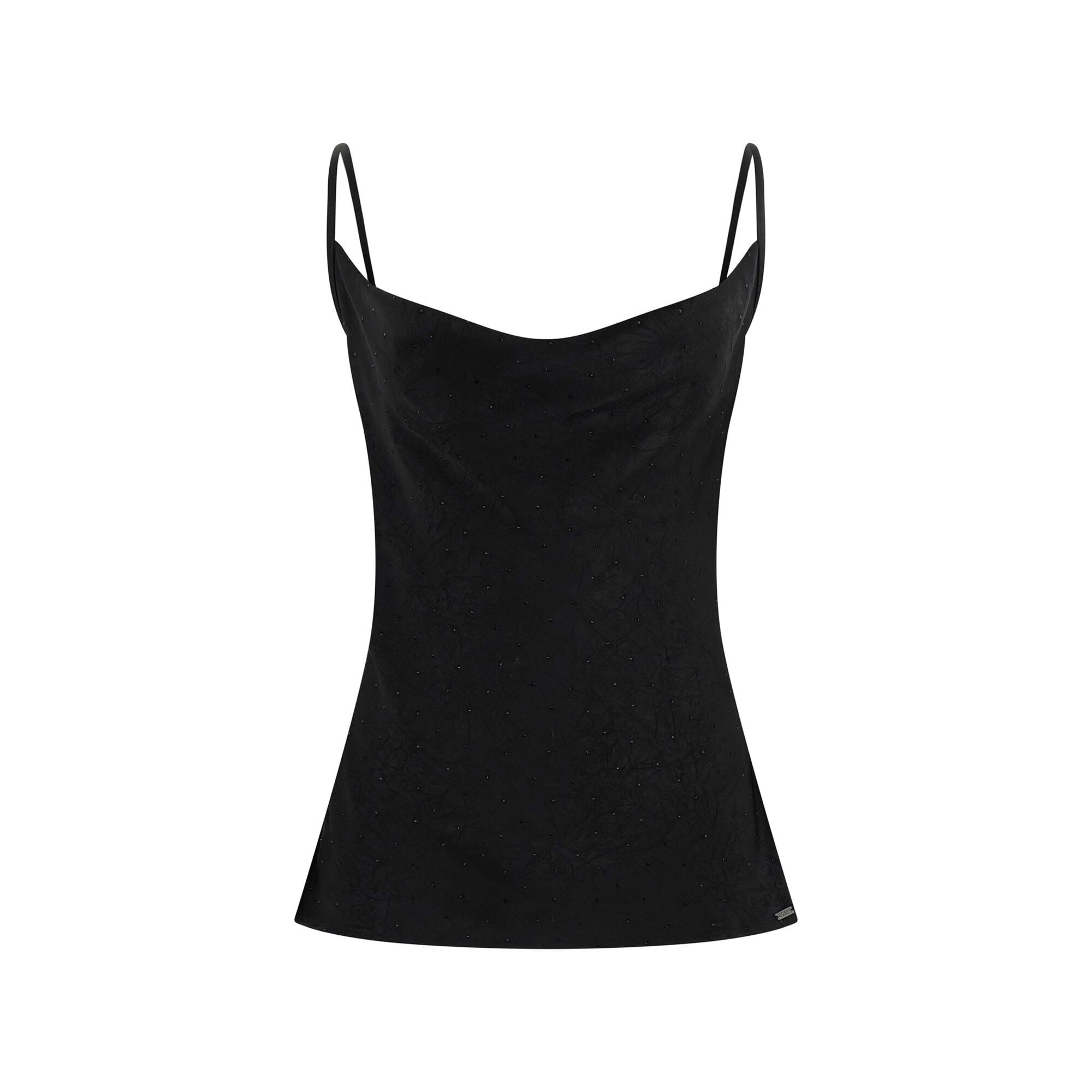 . Top en satin.. Sans manches.. Bretelles spaghetti.. Coupe débardeur.. Strass.Longueur totale : 35 cm / 13,8 in.. Le mannequin porte la taille S.. Consulte notre guide des tailles ci-dessus.. Correspond à la taille indiquée.