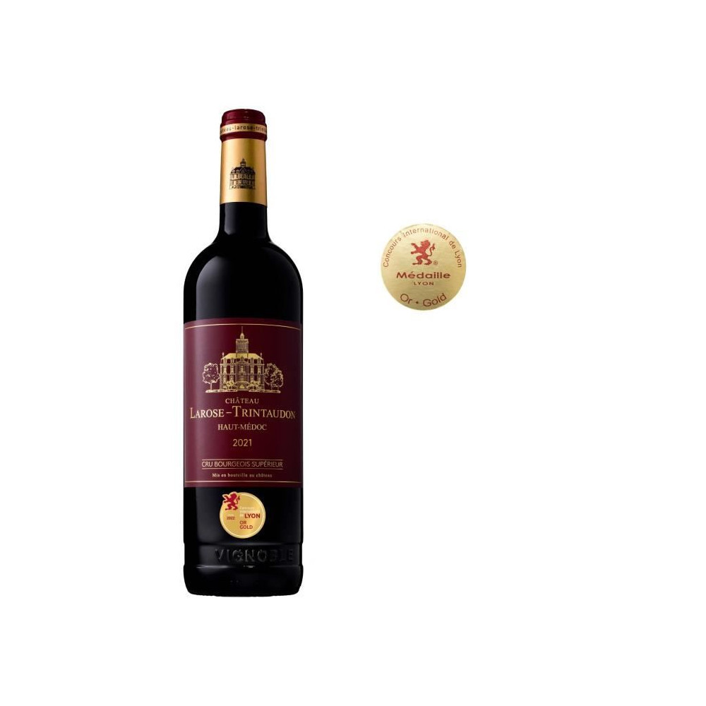 Vin AOC Haut-Médoc Cru Bourgeois Supérieur 2021, Château Larose-Trintaudon, primé (Médaille d'or). Élevé et mis en bouteille par Vignobles de Larose, il offre le caractère bordelais typique avec arômes concentrés, structure élégante et tanins fins. Contient des sulfites.