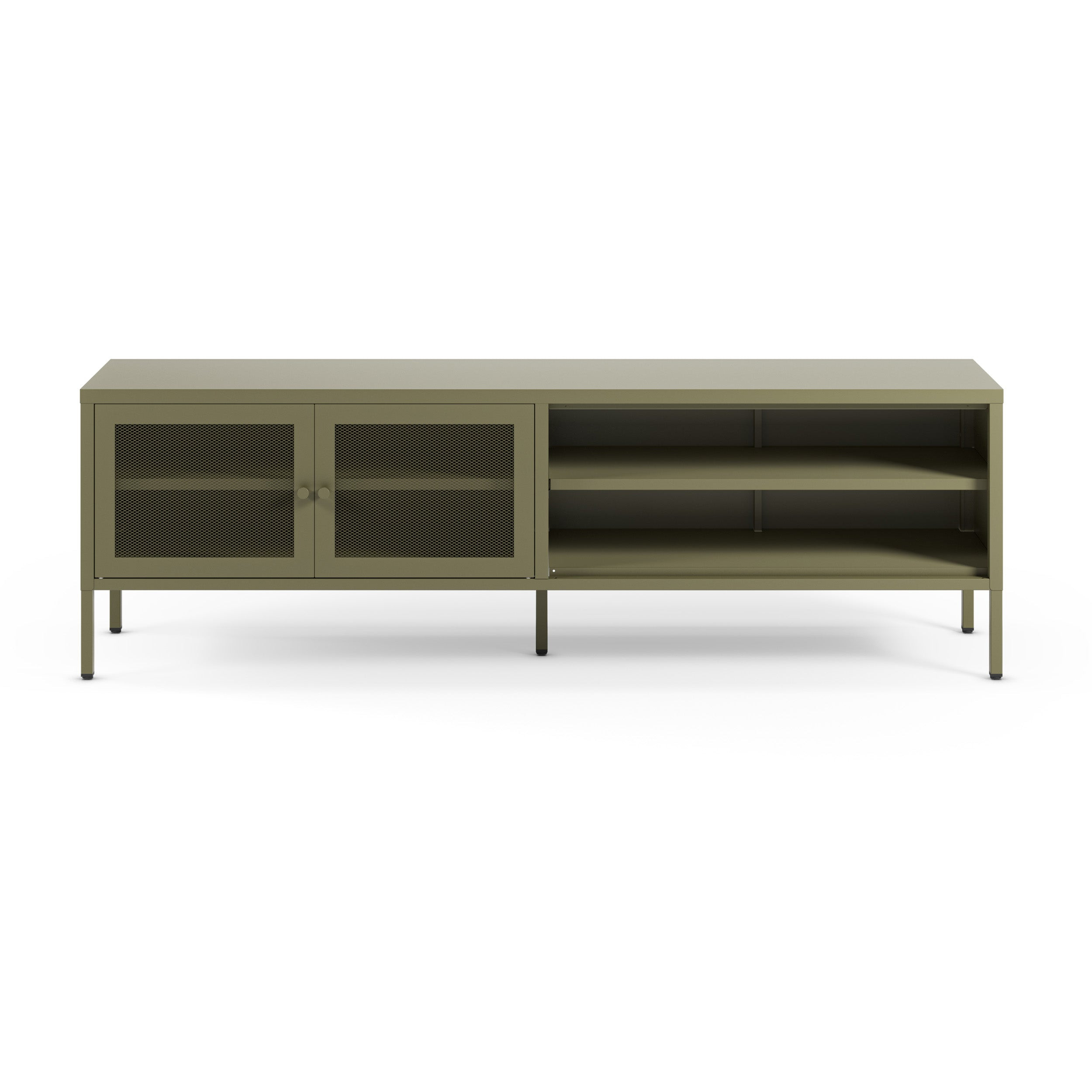 Livraison offerte - Meuble TV Latem en métal vert kaki 2 portes, 160 cm - Avec ses lignes épurées et sa teinte vert sauge apaisante, le meuble TV Latem apporte une touche design à votre salon. Sa structure en métal ajouré allie légèreté visuelle et solidité, tandis que ses portes grillagées assurent une bonne ventilation pour vos appareils électroniques. Doté d’étagères ouvertes pratiques et de pieds fins, il se fond naturellement dans les intérieurs contemporains. Un meuble aussi esthétique que fonctionnel, à associer avec les autres pièces de la collection Latem.-Contenu : Vendu à l'unitéDimensions : Longueur : 160 cmProfondeur : 35 cmHauteur : 50 cm Hauteur des pieds : 15 cmMatière : Meuble TV en métal Finition revêtement en poudreInfos complémentaires : Poids max : 20 kg sur le plateau supérieur10 kg sur les étagèresMontage : Meuble en kitPoids produit : 20.5kgEntretien  : Nettoyez régulièrement votre meuble en métal avec revêtement en poudre à l’aide d’une éponge douce et d’eau tiède savonneuse, puis essuyez aussitôt avec un chiffon microfibre pour éviter les traces. N’utilisez jamais de produits abrasifs, acides ou à base d’alcool qui pourraient altérer la finition protectrice.Information colis : 167 x 46 x 12 cmRecyclabilité : Non recyclable