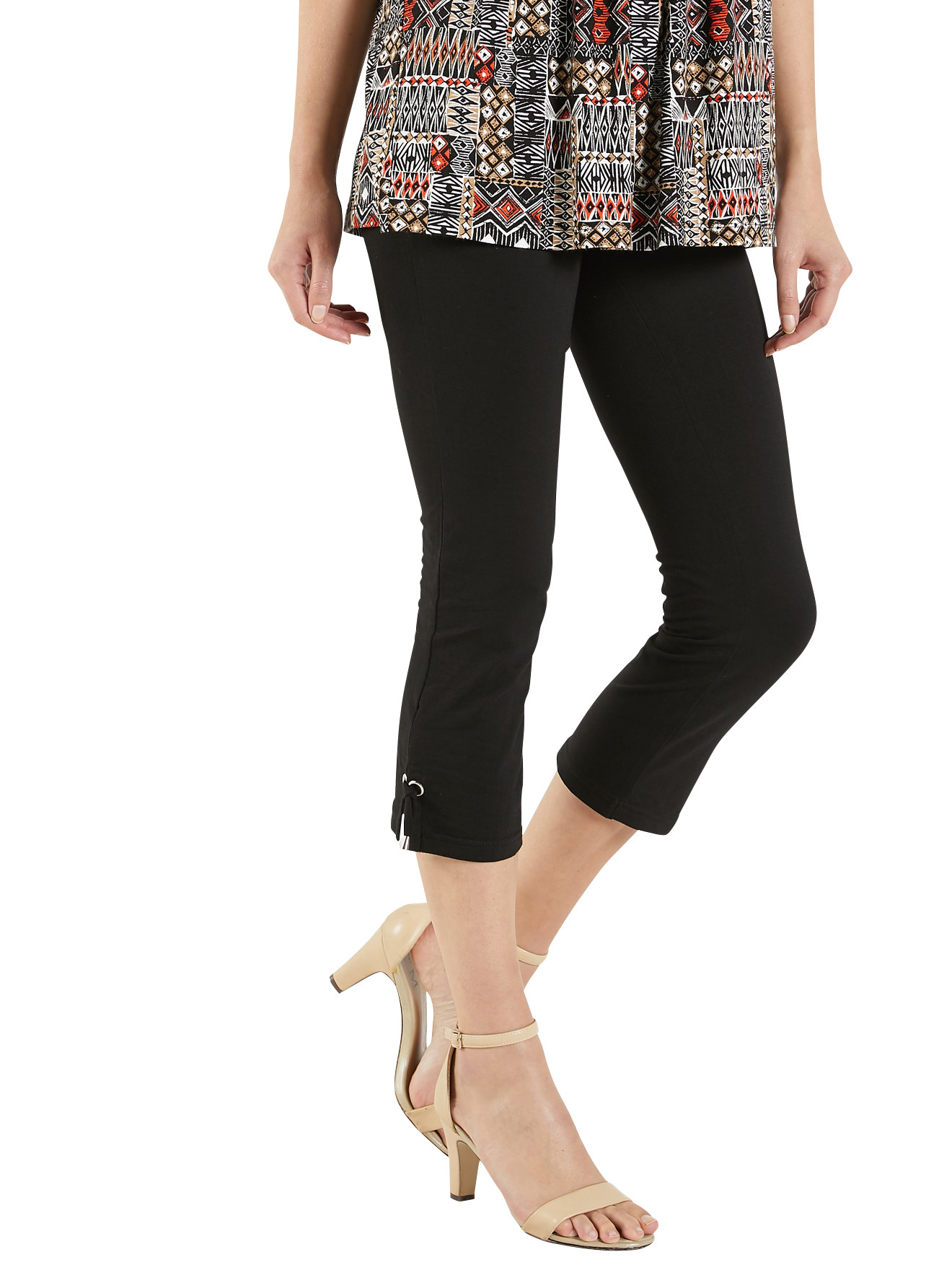 Fantaisie de nouette sur gros oeillets argentés au bas des jambes. Taille élastiquée. Entrejambe 51 cm, bas 17 cm COTON MAJORITAIRE Lavage normal 30° Repassage à temp. faible 110°C Nettoyage à sec interdit Séchage tambour interdit