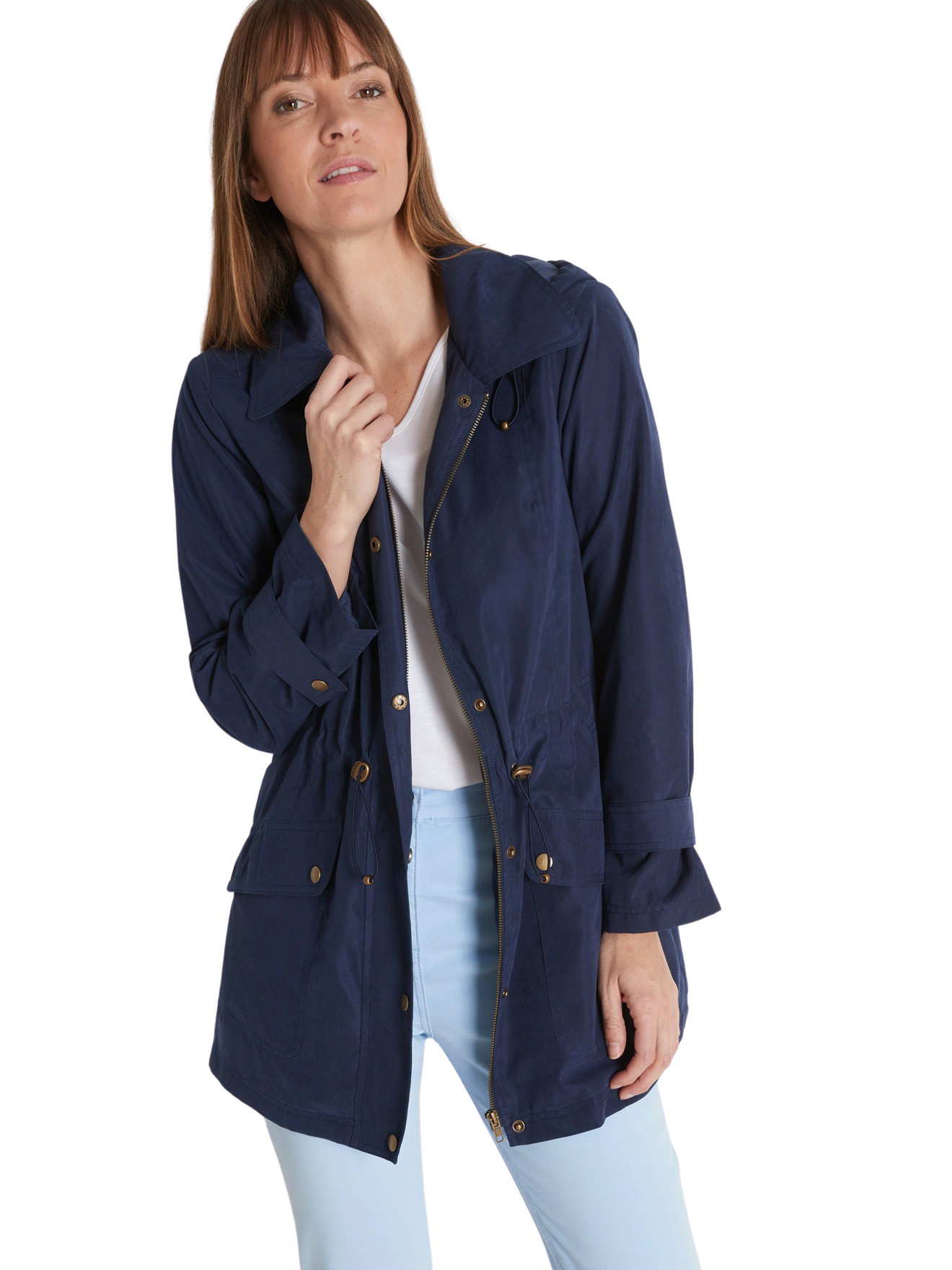 Tellement facile à vivre qu'on l'emporte partout ! Col légèrement arrondi. Glissière métal sous patte pressionnée. Empiècement épaules et dos. Découpes bretelles devant et dos. Lien de serrage à la taille avec stoppeurs. 2 grandes poches à rabat asymétrique et pressions. Poche intérieure. Patte réglable par pression au bas des manches longues. Capuche amovible par pressions, avec lien et stoppeurs. Doublure tissu. Lavable machine.Longueur 80 à 88cm selon les tailles. Photo retouchée POLYESTER MAJORITAIRE Lavage modéré 30° Repassage à temp. faible 110°C Nettoyage à sec normal Perchlo Séchage tambour interdit