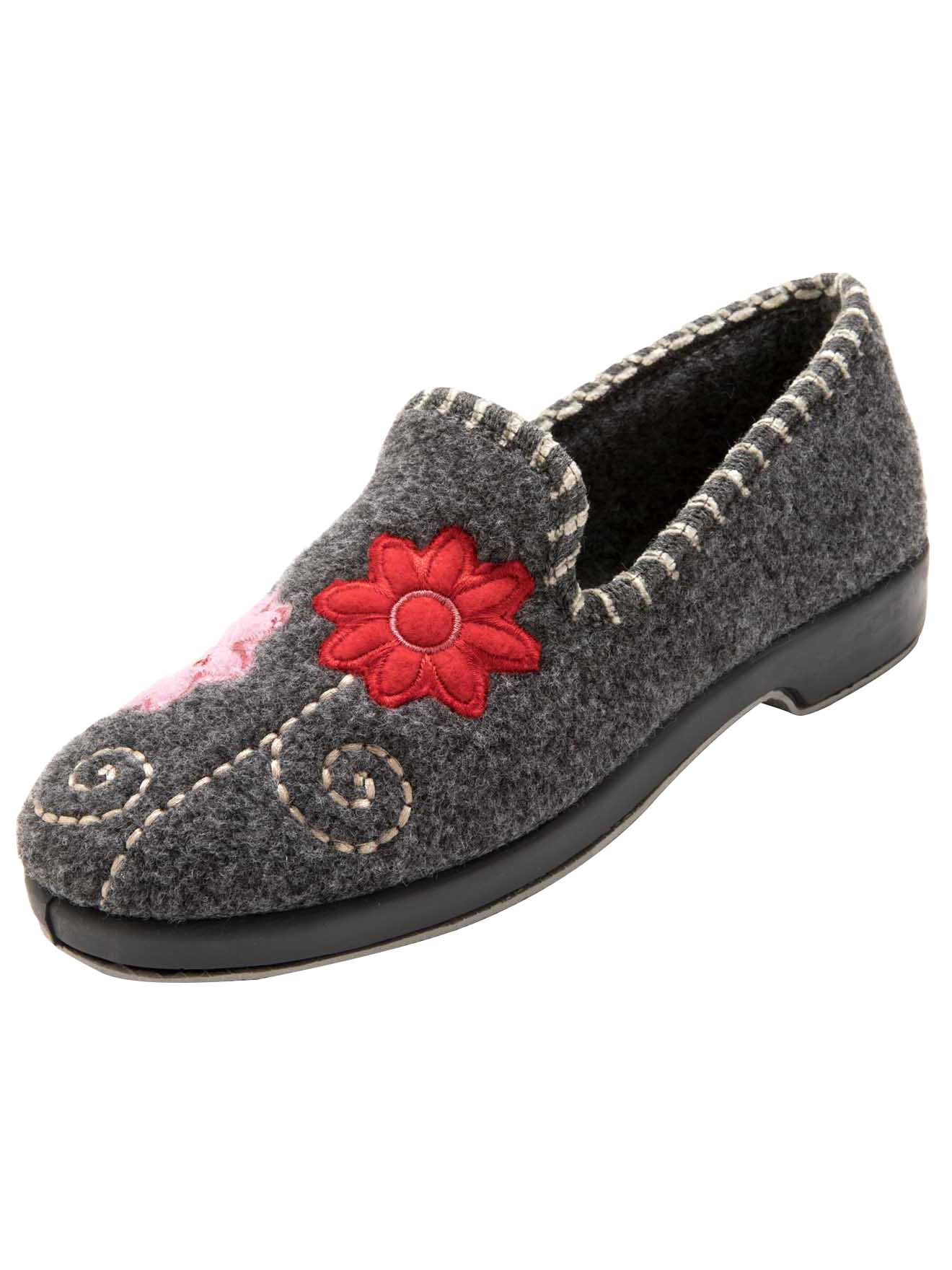 Dessus : velours animé de broderie en feutrine et surpiqûres fantaisie. Doublure : textile velours. Semelle intérieure en textile velours. Semelle : élastomère. Talon 1,5 cm environ. Grande largeur. TEXTILE MAJORITAIRE
