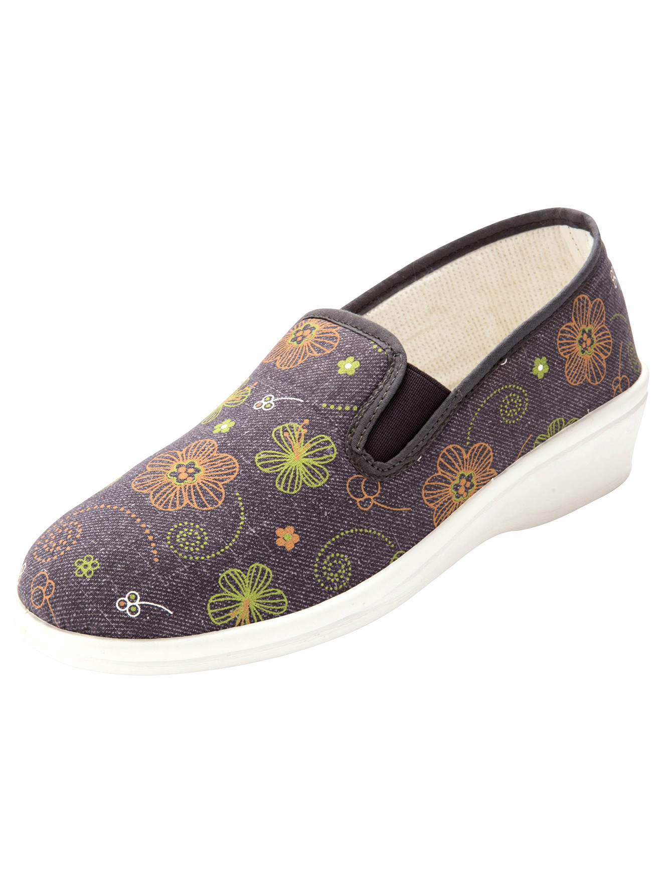 Des sans-gêne super confortables ! Dessus : textile. 2 élastiques d'aisance côtés. Intérieur : éponge saine et tout confort. Semelle : élastomère. Talon compensé : 2,5 cm environ. Large (F). TEXTILE MAJORITAIRE
