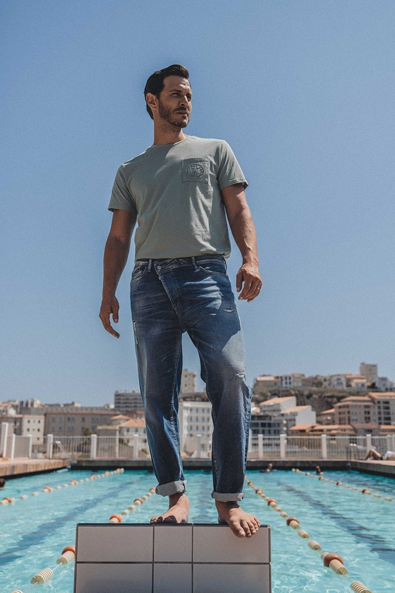 Ce jeans loose 1998 Basic est tendance et original, avec sa fermeture à boutons asymétrique, ses abrasions et ses trous réparés pour encore plus de style.