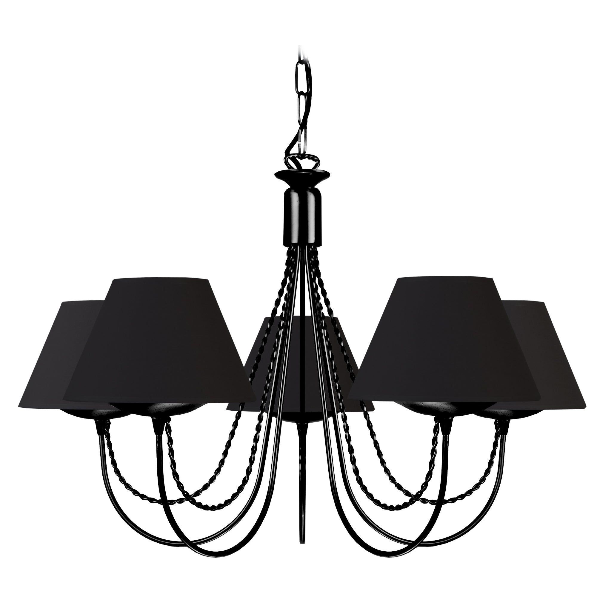 Lustre LEICESTER multi bras métal noir - Abat-jour tissu couleur noir forme conique - Douille E14 x5 lumière - Ampoules non inclus conseillé: LED 7W (halogène, maxi. 40W) type balle de golf G11 - Projection lumineuse vers le bas - Connexion réseau électrique: boîtier de connexion isodom - Interrupteur non inclus - Style charme - Classe de Protection I - Indice de protection: IP20 - Dimmable , dimmer non inclus - Tension de fonctionnement : 230V - Tension d'alimentation : 230V - Dimension abat-jour: Hauteur 12cm x Longueur 18cm x Largeur 9cm - Dimension global: Hauteur 46cm x Longueur 62cm x Largeur 62cm - Poids net du produit: 2,3Kg