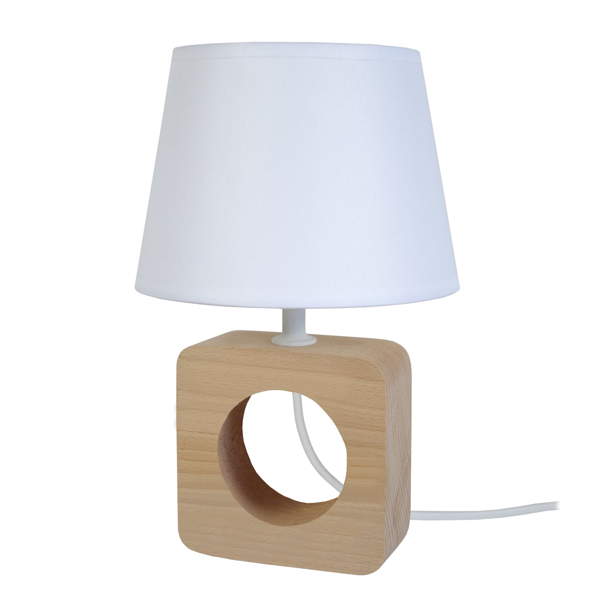 Cette lampe de chevet contemporaine ajoute un design élégant et beaucoup de lumière à votre chambre à coucher. La base rectangulaire est faite de bois massif, originaire des forets françaises et de gestion éco-durable. Cette lampe est coiffée d'un abat-jour en tissu qui diffuse la lumière d'une ampoule de 40 W (non incluse) dans tout votre espace. Elle est conçue pour mettre une de chaque côté des lits, mais elle va très bien aussi sur votre bureau, vestibule ou même sur la table de votre coin de lecture ou travaille, avec une lumière douce et plaisante. - Lampe de chevet KEBO carré bois naturel et blanc - Abat-jour tissu couleur blanc forme tambour - Douille E14 x1 lumière - Ampoule non inclus conseillé: LED 7W (halogène, maxi. 40W) type balle de golf G11 - Projection lumineuse ambiant - Connexion réseau électrique: prise électrique de type C (Europlug) ou de type G (UK) - Interrupteur sur le câble électrique - Style inspiration nordique - Classe de Protection II - Indice de protection: IP20 - Dimmable , dimmer non inclus - Tension de fonctionnement : 230V - Tension d'alimentation : 230V - Dimension abat-jour: Hauteur 11cm x Longueur 16cm x Largeur 12cm - Dimension global: Hauteur 25,5cm x Longueur 16cm x Largeur 16cm - Poids net du produit: 0,4Kg
