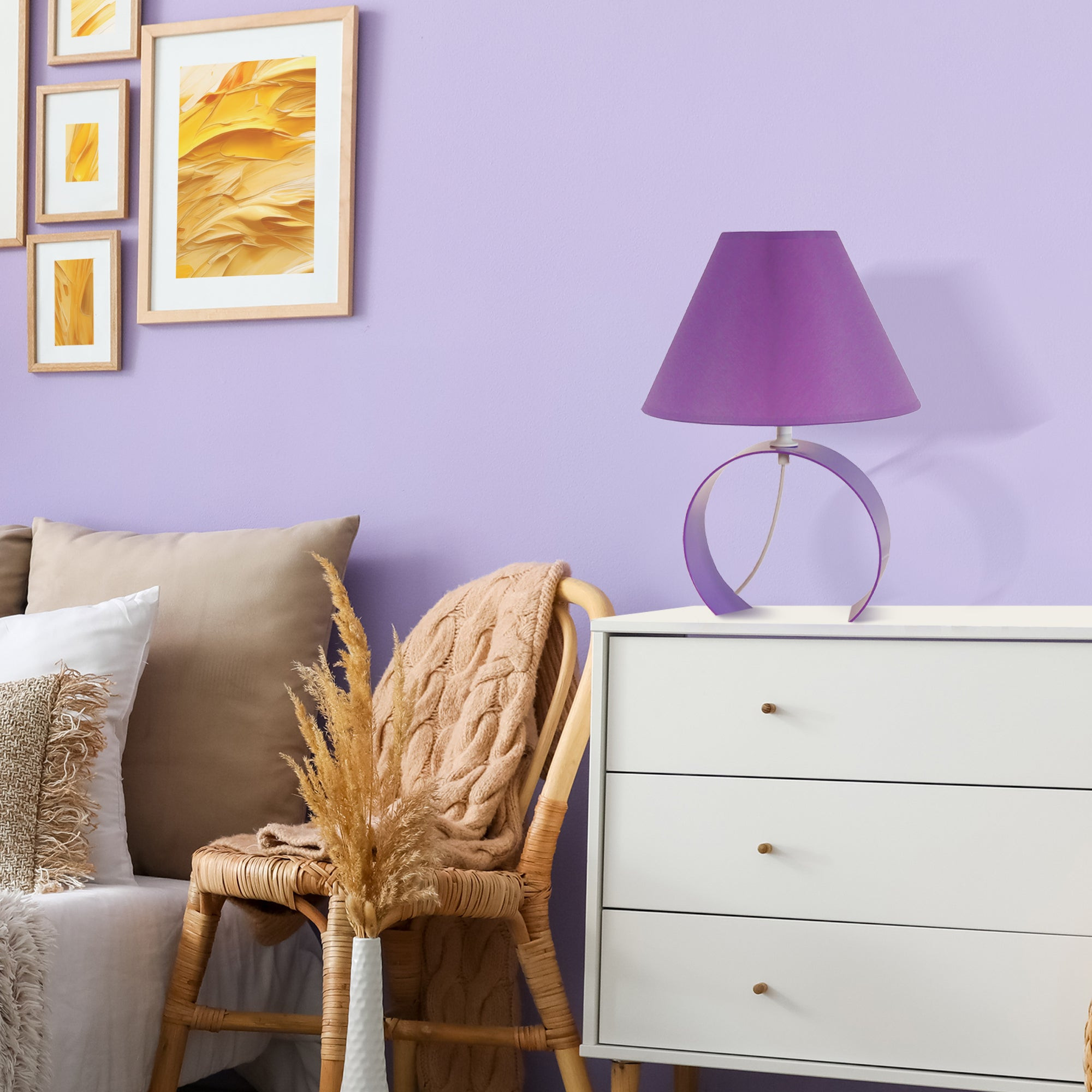 La conception moderne de la lampe est compacte et convenant à toute coiffeuse, table de chevet ou bureau. Elle est assez lumineuse pour ajouter une touche d'élégance à la pièce et s'agencera à tous les styles de décoration! Cette lampe est très pratique: placez-la dans une pièce non seulement pour éclairer, mais aussi comme décoration. Vous pouvez la placer dans les salons, salles familiales, bureaux, dortoirs universitaires ou les bars, hôtels, cafés ou autres endroits. Lampes à poser TOSEL KOLI *Style pop colormétalmétal* Couleur Violet *Forme: demi-cercle *Dimensions du produit installé : Hauteur: 31 cm, Longueur: 22 cm, Largeur: 22 cm,Diamètre: 22 cm, Profondeur: 22 cm, Non réglable en hauteur.*Materiel/(Materiaux) de l' (les) Abat-jour(es):tissucoton*Dimensions de l'abat-jour:Supérieur 9 cm, Inférieur 22 cm, Hauteur 15 cm, cm.* Matériaux du produit, Tôle, tube, fil d'acier, aluminium où laiton 100% recyclables,- Peinture électrostatique sur le métal à base de polymères en poudre et à très faibles émissions de COV (composés organiques volatils), respectueuse de l’environnement, - *Finition : peinture électrostatique sur le métal à base de polymères en poudre et à très faibles émissions de COV -, composés organiques volatils. *Forme abajourconique *Éclairage intérieur, * Tension électrique : 220 à 250 Volts. * Isolation électrique : classe, II. *Indice de protection aux poussières : IP20. *Culot, E14 1 lumière, * Ampoule max. 40W (non incluse). Professionnel, disponible, répondant dans un délai maximum de 48 heures, 6 jours sur 7 (de 10h00 à 19h00 heure portugaise) à toutes les questions posées, soit sur la plateforme où l'achat est effectué ou a été effectué, soit par téléphone au +351 244 890 160.