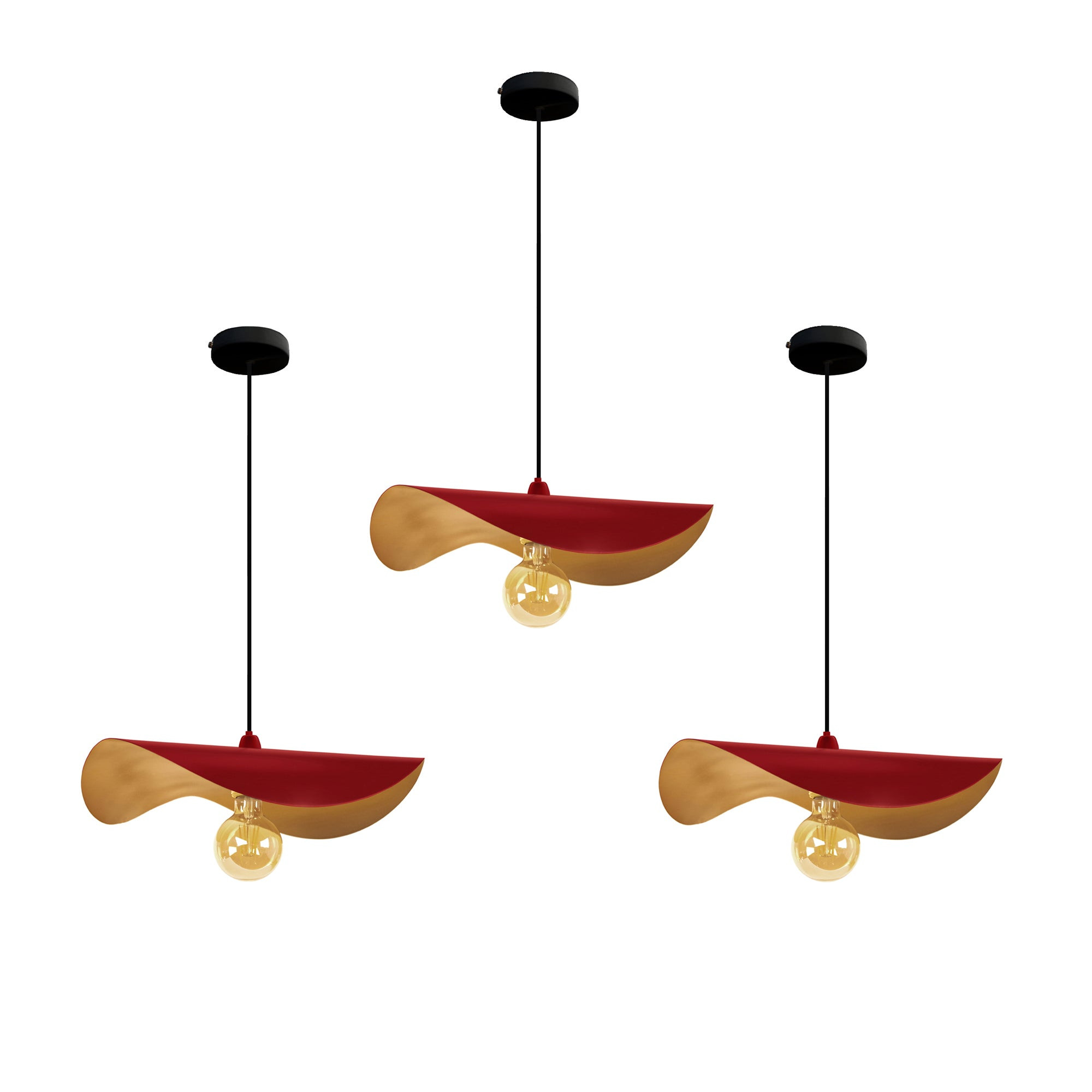 Un design original en tôle de fer fine avec peinture époxy et une couleur intérieure dorée pour un effet cosy et agréable. Créez l'ambiance idéale avec la réflexion de la suspension en ajustant vers le haut ou vers le bas les deux rondelles de la douille, qui monte ou baisse l'ampoule pour une réflexion à diamètre variable. Suspension idéale dans une cuisine ou un salon pour sublimer votre décoration intérieure. Livré en trois unités. Suspension TOSEL MADAME LOT 3 *Style vintagemétalmétal* Couleur Rouge *Forme: asymétrique, *Dimensions du produit installé : Hauteur: 65 cm, Longueur: 40 cm, Largeur: 40 cm,Diamètre: 40 cm, Profondeur: 40 cm, Réglable en hauteur.*Materiel/(Materiaux) de l' (les) Abat-jour(es):métal tôle d'acier *Dimensions de l'abat-jour:Supérieur 6 cm, Inférieur 40 cm, Hauteur 7 cm, cm.* Matériaux du produit, Tôle, tube, fil d'acier, aluminium où laiton 100% recyclables Peinture électrostatique sur le métal à base de polymères en poudre et à très faibles émissions de COV (composés organiques volatils), respectueuse de l’environnement, - *Finition : peinture électrostatique sur le métal à base de polymères en poudre et à très faibles émissions de COV -, composés organiques volatils. *Forme abajourabstract *Éclairage intérieur, * Tension électrique : 220 à 250 Volts. * Isolation électrique : classe, II. *Indice de protection aux poussières : IP20. *Culot, E271 lumières, * Ampoule max. 40W (non incluse). Professionnel, disponible, répondant dans un délai maximum de 48 heures, 6 jours sur 7 (de 10h00 à 19h00 heure portugaise) à toutes les questions posées, soit sur la plateforme où l'achat est effectué ou a été effectué, soit par téléphone au +351 244 890 160.
