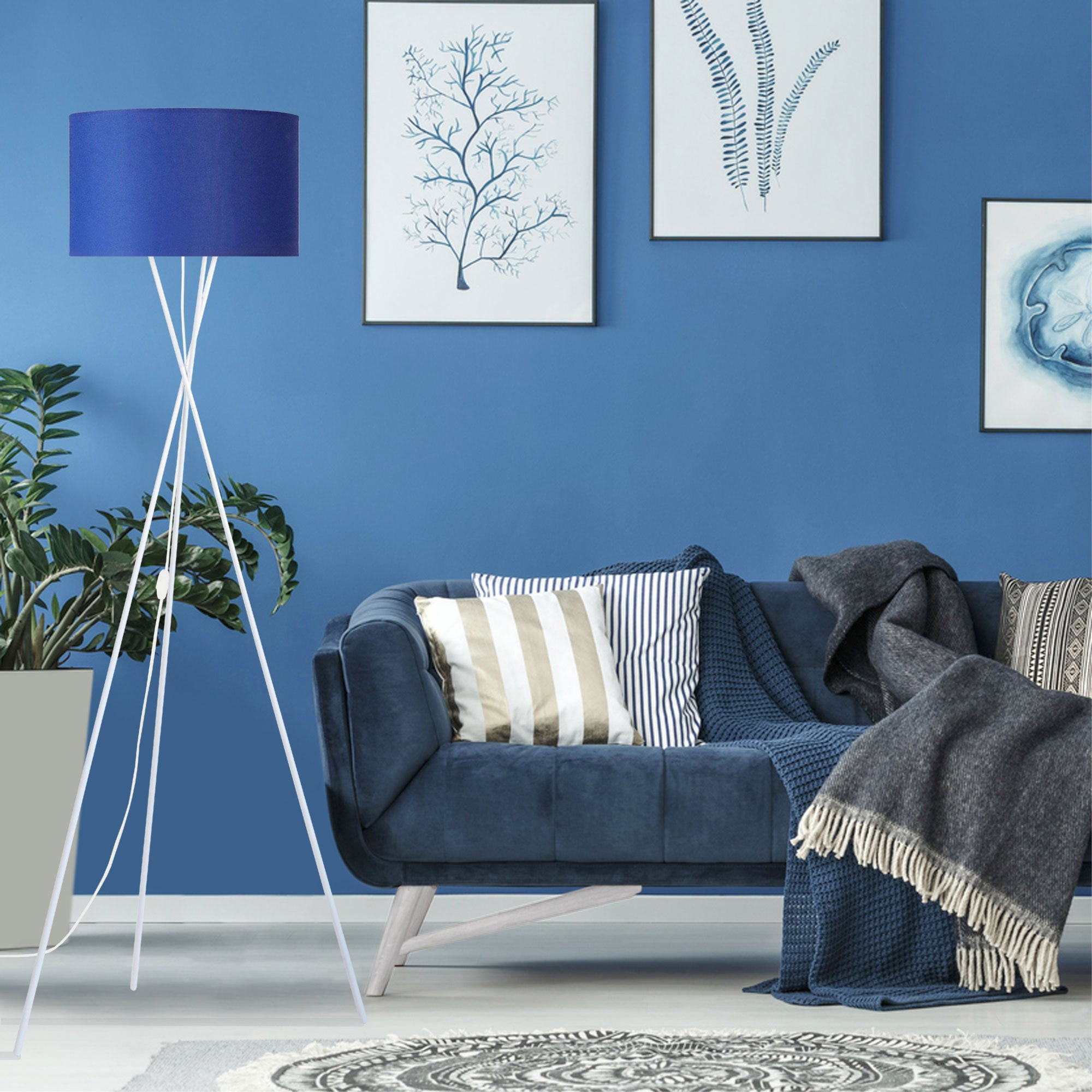 Illuminez votre maison avec ce lampadaire. Ses lignes épurées créeront un sentiment de minimalisme paisible tout en ajoutant une personnalité élégante à n'importe quelle pièce. L'endroit idéal pour lire un livre ou pour déguster un bon verre de vin après une longue journée de travail, vous apprécierez tout ce que cette lampe peut vous apporter, que ce soit l'abat-jour en tissu qui empêche la lumière d'être trop vive ou les trois robustes tiges qui forment la base. C'est le complément parfait à n'importe quel salon, bureau ou chambre à coucher. - Lampadaire MIDGARD trépied métal blanc et bleu - Abat-jour tissu couleur bleu forme cylindrique - Douille E27 x1 lumière - Ampoule non inclus conseillé: LED 7W (halogène, maxi. 40W) type standard A19 - Projection lumineuse ambiant - Connexion réseau électrique: prise électrique de type C (Europlug) ou de type G (UK) - Interrupteur sur le câble électrique - Style inspiration nordique - Classe de Protection II - Indice de protection: IP20 - Dimmable , dimmer non inclus - Tension de fonctionnement : 230V - Tension d'alimentation : 230V - Dimension abat-jour: Hauteur 20cm x Longueur 35cm x Largeur 35cm - Dimension global: Hauteur 150cm x Longueur 60cm x Largeur 60cm - Poids net du produit: 2Kg