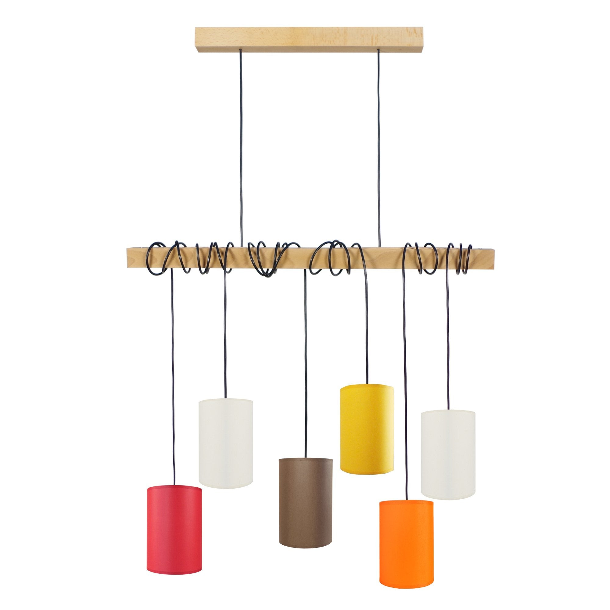 Parmi les matériaux utilisés, on retrouve le bois de hêtre d'origine française, exploité dans des forêts éco-durables. Aussi, de ce luminaire en forme de poutre se détachent deux cordes qui descendent verticalement vers le bas et supportent une autre large poutre aussi en bois de hêtre massif. Les câbles sont enroulés de façon apparemment aléatoire autour de cette poutre. Ils se terminent à différentes hauteurs vers le bas et portent des abat-jours de verre coloré. Lustre TOSEL HARLEM *Style inspiration nordiqueboisbois* Couleur naturel*Forme: grappe six, *Dimensions du produit installé : Hauteur: 180 cm, Longueur: 12 cm, Largeur: 12 cm,Diamètre: 12 cm, Profondeur: 80 cm, Réglable en hauteur.*Materiel/(Materiaux) de l' (les) Abat-jour(es):tissucoton*Dimensions de l'abat-jour:Supérieur 12 cm, Inférieur 12 cm, Hauteur 20 cm, cm.* Matériaux du produit, bois d'étre où fresne massif, originaire de forêts française de gestion écodurables,- abat-jours tissu coton,- Traitement du bois ; essuyé á huile végétal, - *Finition : traité avec de l'huile végétale. *Forme abajourconique *Éclairage intérieur, * Tension électrique : 220 à 250 Volts. * Isolation électrique : classe, II. *Indice de protection aux poussières : IP20. *Culot, E14 6 lumières, * Ampoule max. 40W (non incluse). Professionnel, disponible, répondant dans un délai maximum de 48 heures, 6 jours sur 7 (de 10h00 à 19h00 heure portugaise) à toutes les questions posées, soit sur la plateforme où l'achat est effectué ou a été effectué, soit par téléphone au +351 244 890 160.