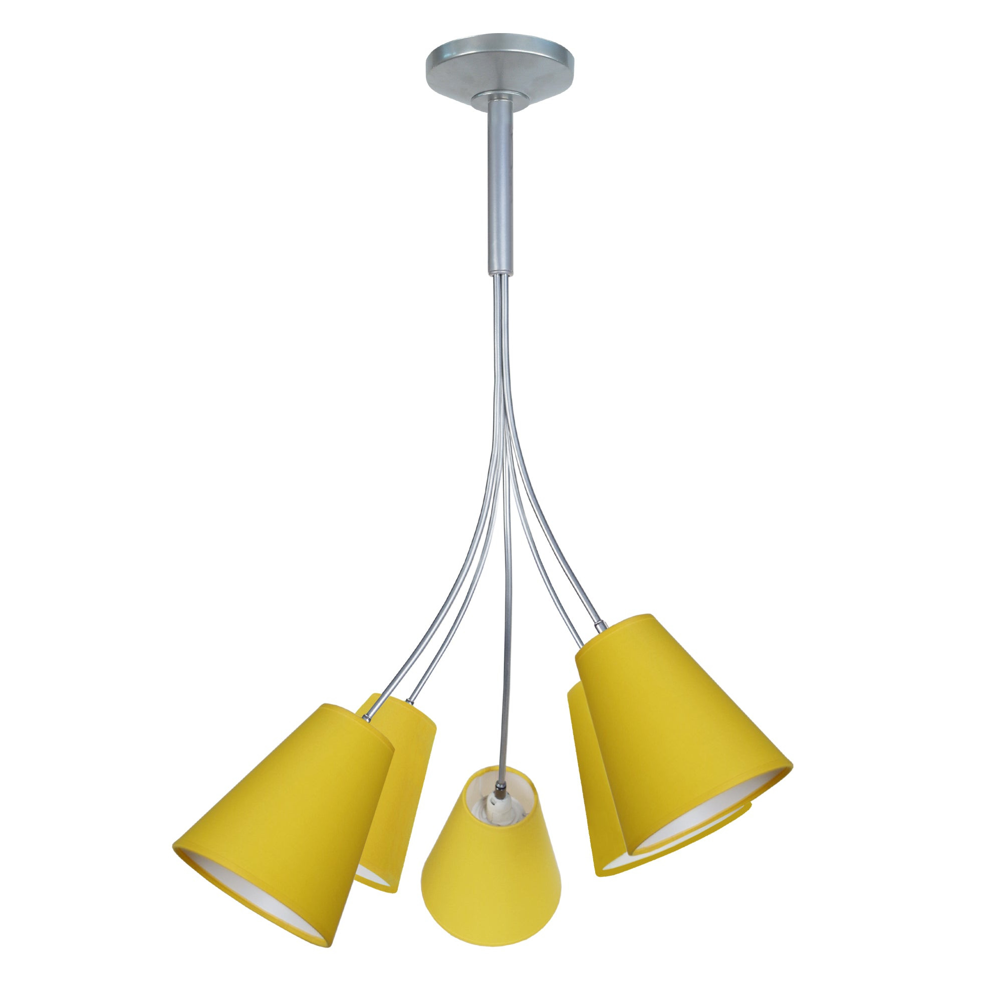 Lustre DUNNS multi bras métal aluminium et jaune - Abat-jour tissu couleur jaune forme conique - Douille E14 x5 lumière - Ampoules non inclus conseillé: LED 7W (halogène, maxi. 40W) type standard A19 - Projection lumineuse vers le bas - Connexion réseau électrique: boîtier de connexion isodom - Interrupteur non inclus - Style urbain - Classe de Protection I - Indice de protection: IP20 - Dimmable , dimmer non inclus - Tension de fonctionnement : 230V - Tension d'alimentation : 230V - Dimension abat-jour: Hauteur 20cm x Longueur 18cm x Largeur 8cm - Dimension global: Hauteur 85cm x Longueur 80cm x Largeur 80cm - Poids net du produit: 1,2Kg