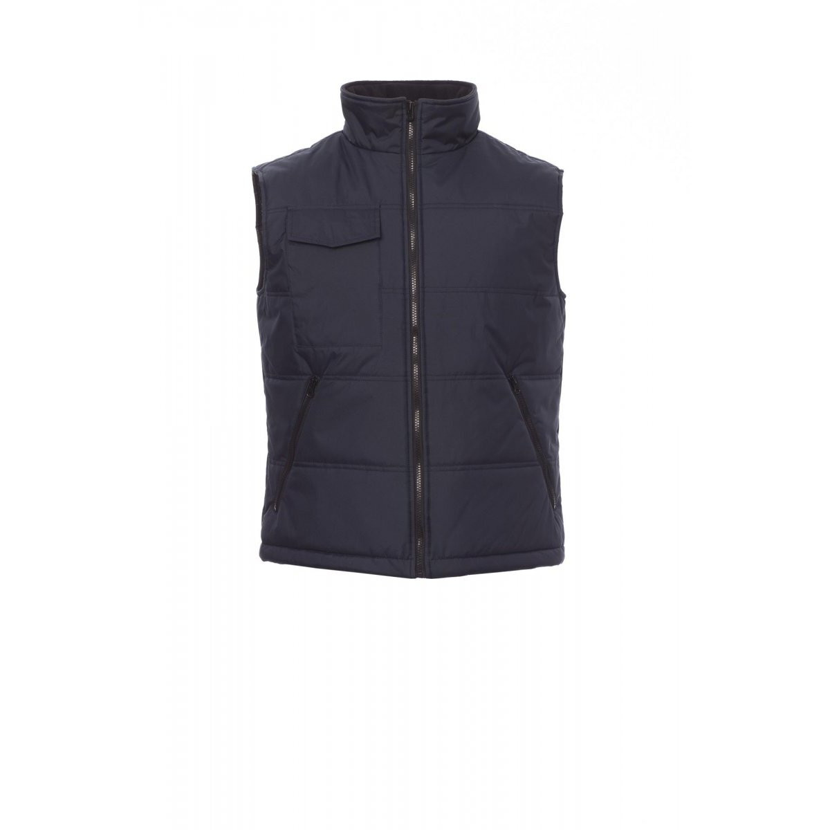 Gilet matelassé avec arrière profilé et rembourrage surpiqué, finition avec doublure haute densité, intérieur du col en polaire. Deux grandes poches zippées, poche porte-téléphone sur la poitrine et poche intérieure. - Composition: 100% POLYESTER - Aspect: PONGEE PVC 190T - Poids: 180 GR/MQ - Emballage: 1/10