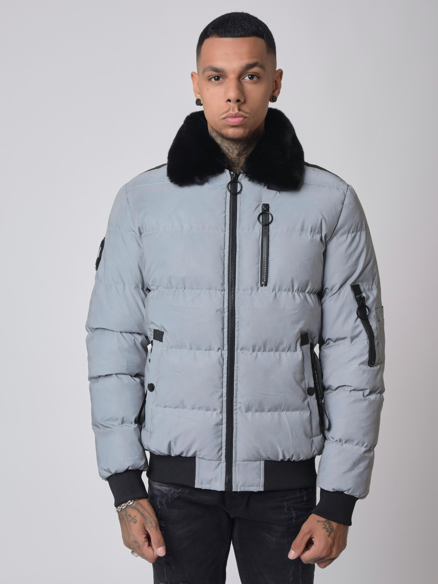 Col aviateur faussure fourrure Matelassage Fermeture et poches zippées rond Sangles logotés Project X Paris aux poches Finition bords-côtes Détail bandes contrastés aux épaules Patch logo sur la manche 100%Polyester Le mannequin mesure 1.85m pour 80kg et porte du L