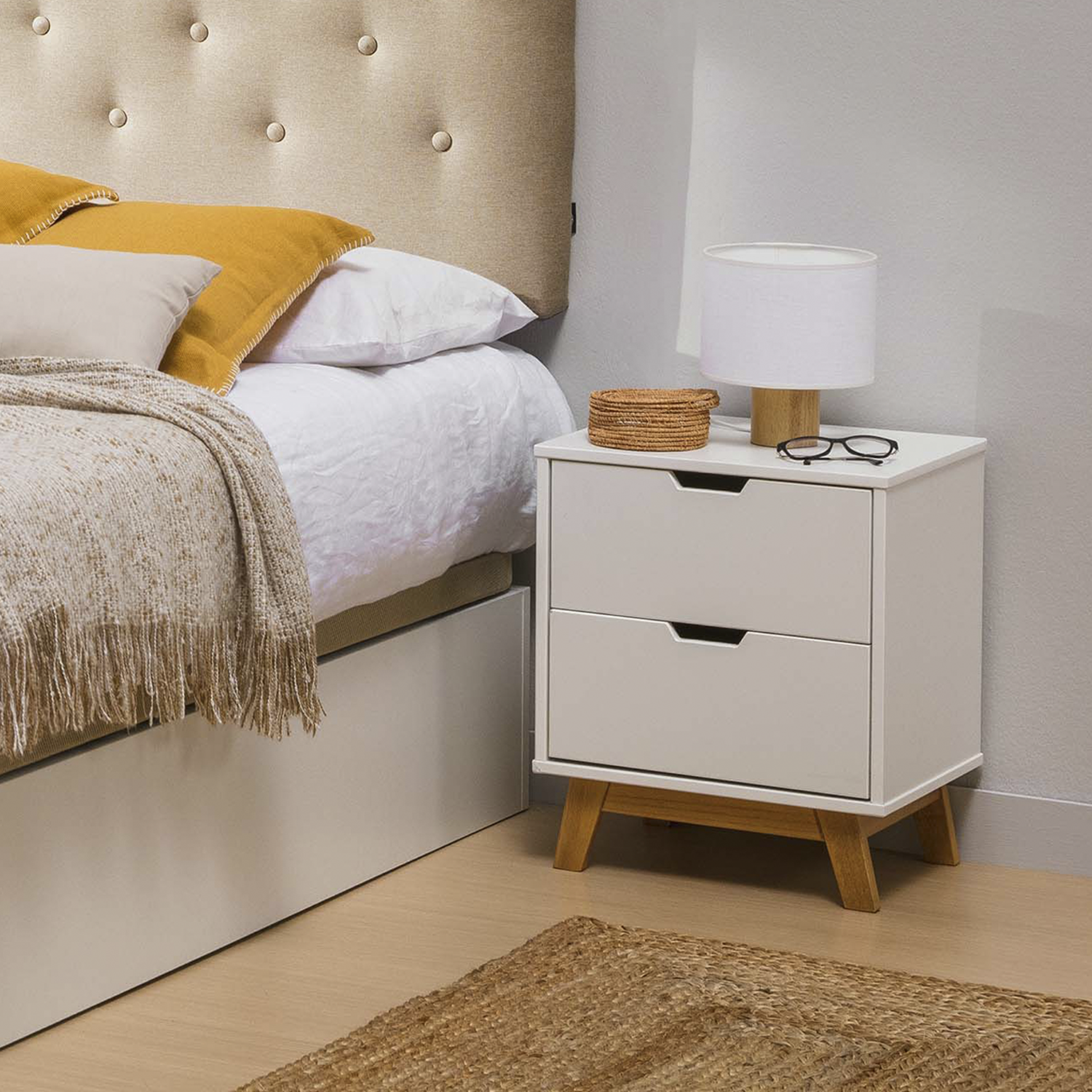 Table de Chevet Miranda 2 tiroirs Blanc, MDF laqué en couler Blanc