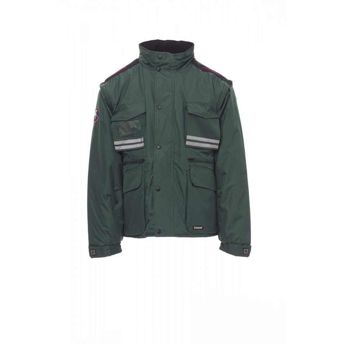 Blouson homme, avec manches détachables, zip de 8 mm en plastique avec curseur en métal, rabat et boutons en plastique, capuche profilée détachable et/ou repliable dans le col, poignets réglables, passepoils réfléchissants gris devant et derrière, coudes préformés, fente latérale à soufflet et zip, neuf poches extérieures dont deux LOCK SYSTEM, deux zippées et intérieur renforcé, une avec porte-badge réversible. Intérieur : rembourré, col, dos et chauffe-reins en micropolaire, inserts transpirants sous le bras, coulisse à la taille et fermeture éclair intérieure pour faciliter impressions et broderies. - Composition: 100% POLYESTER - Aspect: PONGEE RIPSTOP 240T - Poids: 200 GR/MQ - Emballage: 1/5