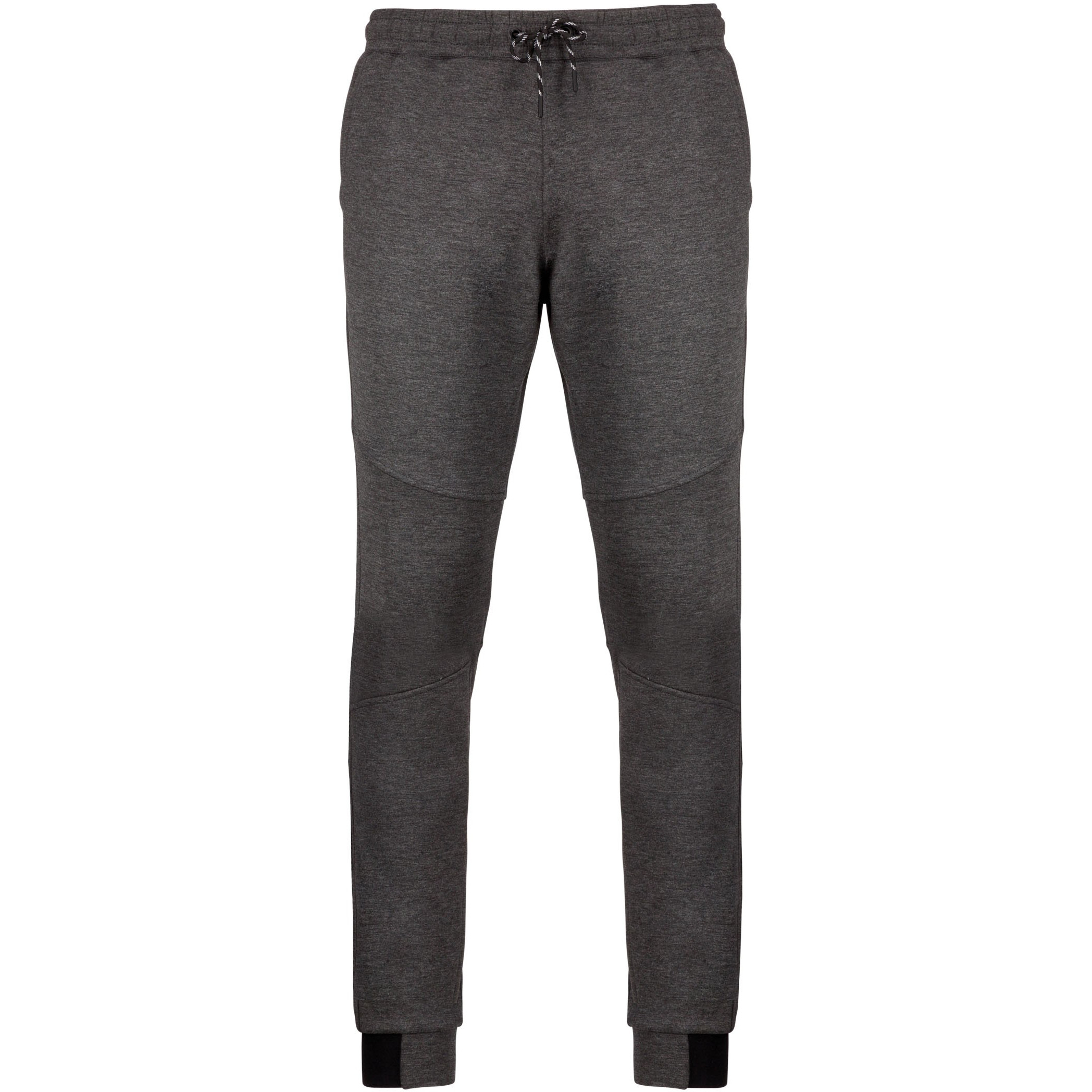 94% polyester / 6% élasthanne (79% polyester / 15% viscose / 6% élasthanne pour coloris chiné). Matière ultra confortable. Ceinture élastiquée avec cordon de serrage bicolore finition embout plastique. 2 poches devant doublure jersey 65% polyester / 35% coton et 1 poche arrière zippée finition thermosoudée. Coupe moderne et ajustée avec empiècements genoux. Bas de jambes resserré avec une partie élastiquée contrastée.