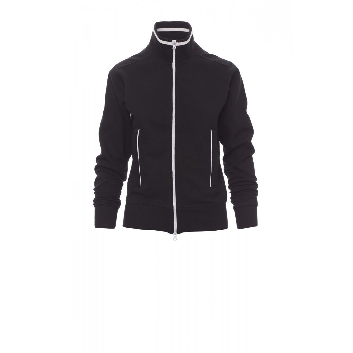 Sweat-shirt femme, coupe cintrée, full zip SBS en plastique contrasté, avec double curseur en métal. Col en bord-côte avec liseré contrasté repris sur les poches latérales . Manches montées, deux poches extérieures avec zip contrasté, poignets et taille en côtes élastiques. Coutures renforcées. - Composition: 70% COTON + 30% POLYESTER - Aspect: BROSSE - Poids: 300 GR/MQ - Emballage: 5/20
