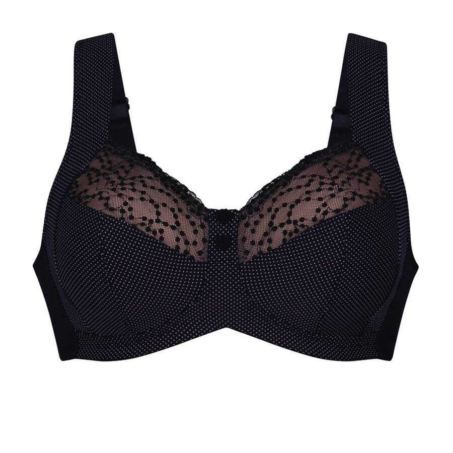 Avec son allure romantique ponctuée d'une touche d'insolence, le soutien-gorge allègement Orely séduit par son motif à pois au charme français. La matière hautement fonctionnelle des bonnets en trois parties garantit un maintien parfait jusqu'au bonnet H. Pour un confort accru, l'entre-bonnets est conçu avec un insert arrondi pour éviter toute pression sur l'estomac, tandis que les bretelles rembourrées et le dos en power tulle allègent agréablement.