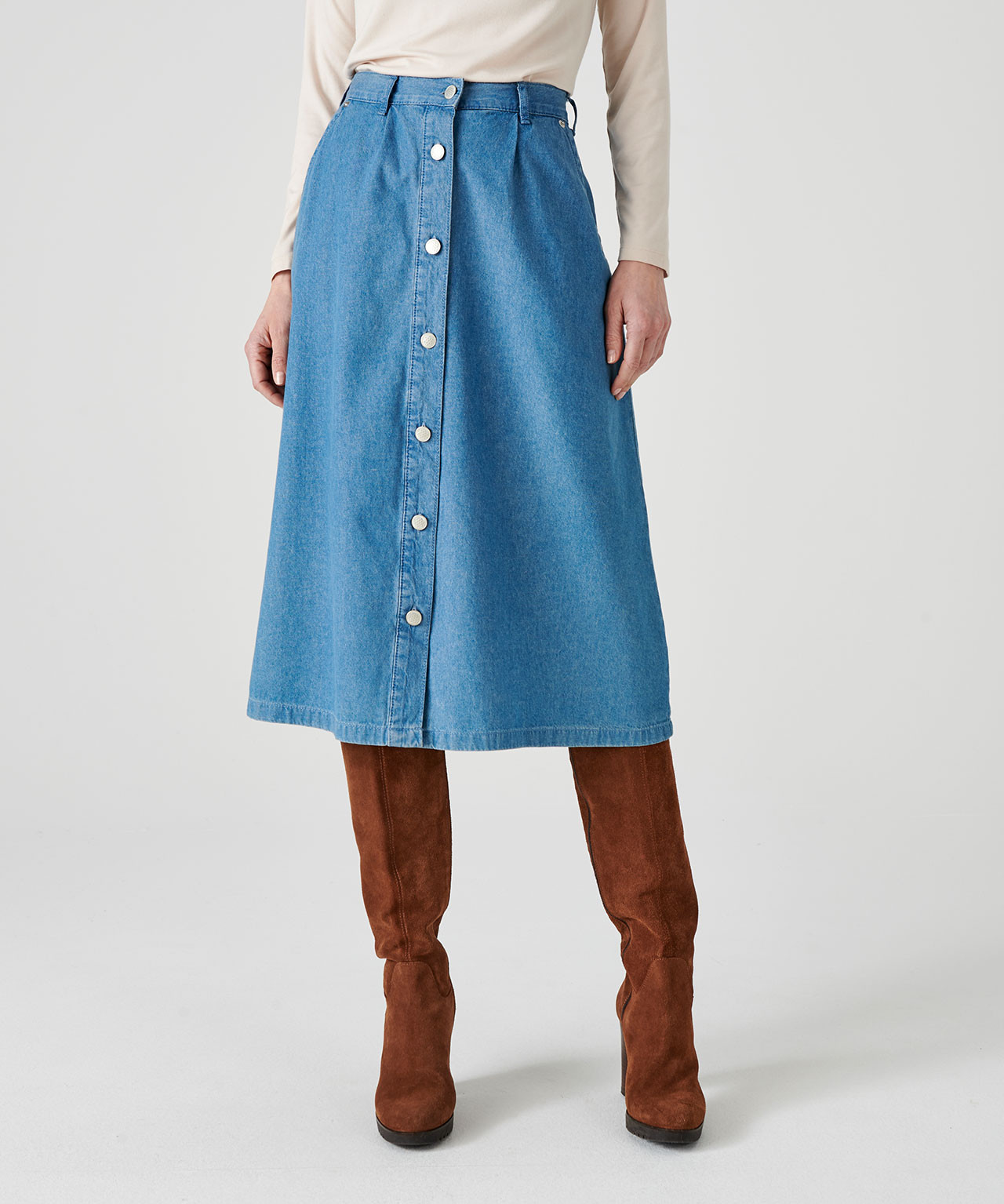 Facile à vivre et à associer, cette jupe est de tous les looks, toutes les envies. Une jupe boutonnée mi-longue qui traverse les modes et les saisons. On laisse un ou deux boutons ouverts à la base pour plus d'aisance. Ceinture à passants, pinces devant et élastiquée dos pour le confort. Coupe ample, entièrement boutonnée devant (boutons métal). Poches à l'italienne soulignées de rivets. 1 poche dos boutonnée. Longueur de la jupe 74 cm environ.