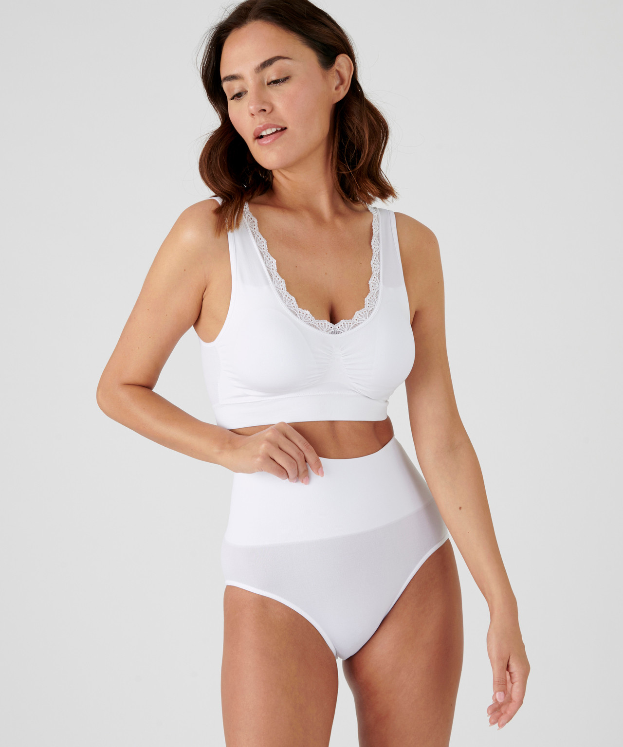 Idéal pour pratiquer un sport, ce soutien-gorge forme brassière vous assure un bon maintien grâce à sa large bande élastiquée sous la poitrine. Féminin, il est orné de dentelle raffinée au décolleté devant et dos. Facile à enfiler, il est réalisé dans une maille douce et extensible. Ces brassières ne comportent pas de coutures pour être discrètes sous les vêtements. Les coques en mousse ampliformes remodèlent avantageusement la poitrine et sont amovibles. Larges bretelles confort. Lot de 2 brassières identiques, même coloris et même taille. ŒKO-TEX® STANDARD 100 CQ1194/1- IFTH.