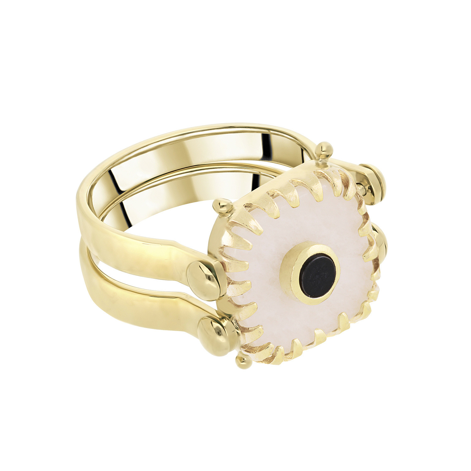 Information sur l'offre : • Bague réversible en laiton doré à l'or fin 14 carats 0,25 microns. • Cabochons en onyx, jade, oeil de tigre, quartz blanc et rose, agate, sodalite. • Entièrement faite à la main. • Éviter le contact avec l'eau, le parfum, les produits chimiques et les cosmétiques. • Garantie sans nickel et sans risque d'allergie. • Hauteur de la bague : 1,3 cm +/- 0,5 mm • Largeur de la bague : 1,3 cm +/- 0,5 mm • Existe en deux tailles: Taille 52 et 54. • Se décline en cinq couleurs. • Livrée dans un pochon Hipanema.