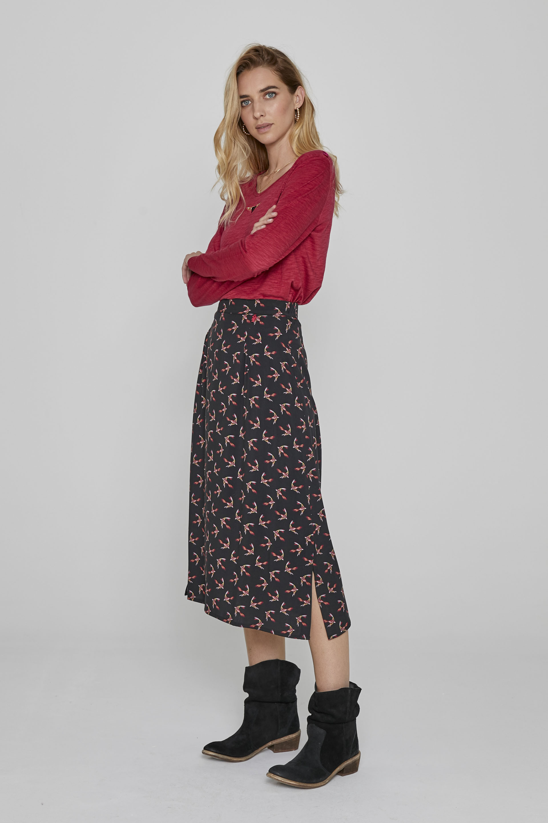 Misez sur la jupe longueur midi en tissu viscose fluide. Ses pinces devant, sa taille semi-élastiquée dos et sa coupe évasée fentes côtés flatteront votre silhouette. En plus, elle donnera à vos hauts de la lumière avec son imprimé italien oiseaux 'Tokyo'. Sans oublier, le fish pampille métal Framboise. Jupe doublée, longueur 76,5cm en taille 0. Notre mannequin mesure 1m76 et porte une taille 0 pour les hauts, taille 26 pour les bas Composition : 100%Viscose
