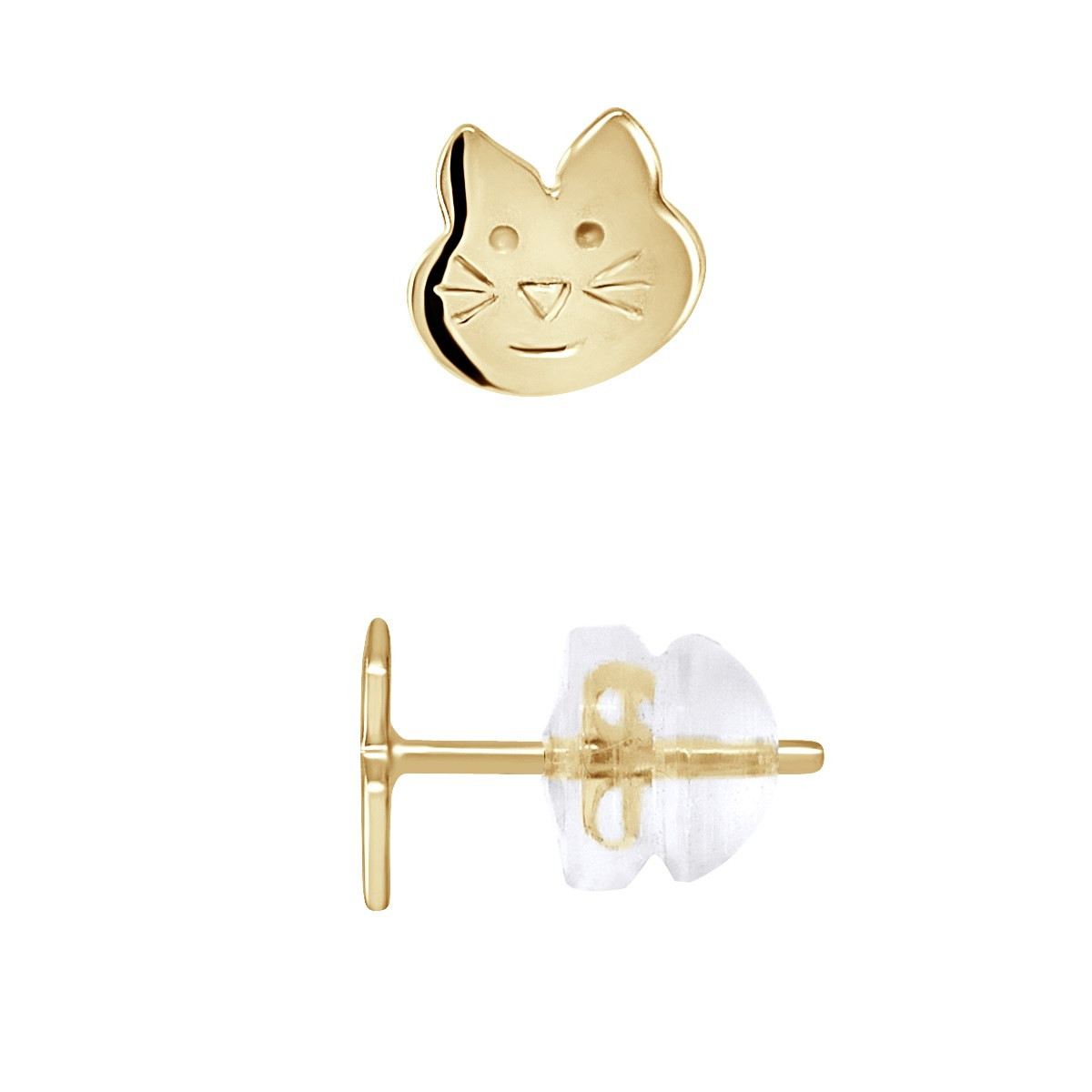 Boucles d'Oreilles Enfant CHAT Or Jaune - Système Poussettes SILICONOR Anallergiques et Imperdables