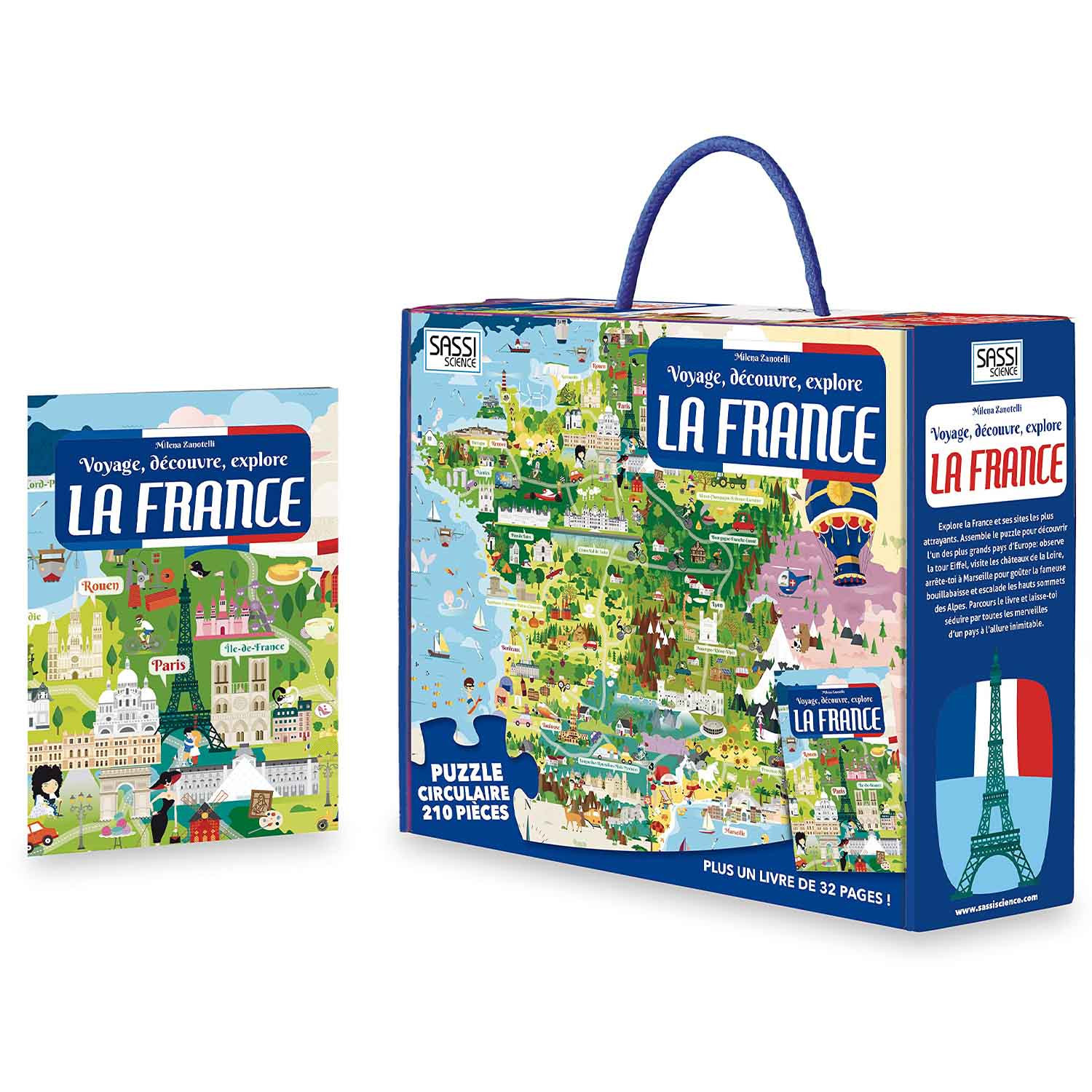 Le joli puzzle et son livre instructif - Voyagez, découvrez, explorez - La France ! Découvrez la France et ses sites les plus attrayants au travers ce grand puzzle de 210 pièces. Une fois toutes les pièces assemblées le puzzle permet à votre enfant de réaliser un fabuleux voyage : observer la Tour Eiffel, visiter les châteaux de la Loire, explorer les famuleuses villes et escalader les hauts sommets des montagnes. Avec le livre de découverte, découvrez milles curiosités puis entrainez la mémoire de votre enfant en reconstituant le splendide puzzle ! Avec sa forme spécifique, le puzzle n'est pas qu'un simple support d'apprentissage, il peut également servir de décoration dans la chambre !
