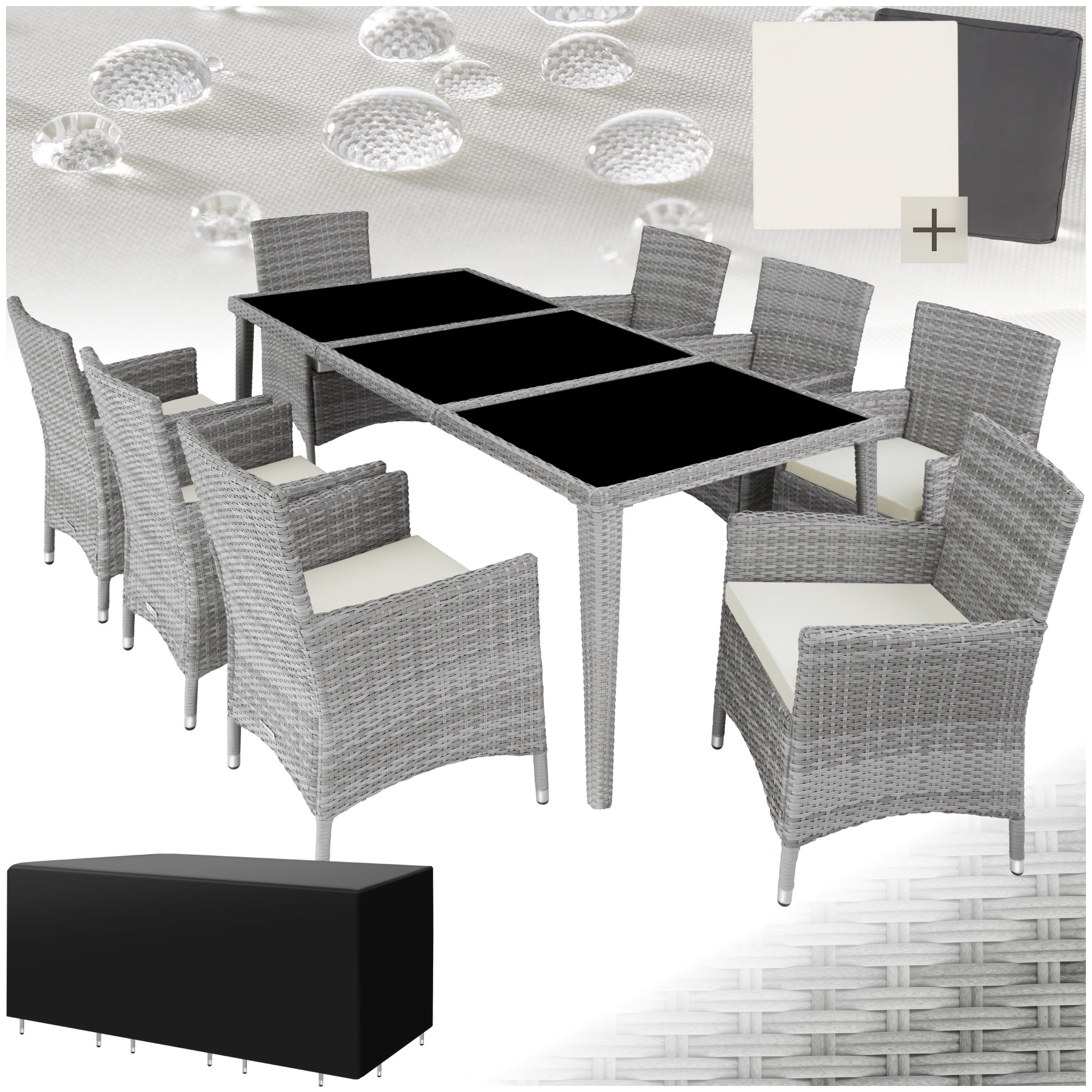 Salon de jardin Menorca Salon de jardin résine, Salon de jardin aluminium - 8 Chaises et 1 Table TECTAKE + 2 Sets de housses inclus (Pour changer la couleur au grès de vos envies) + 1 Habillage pluie. Ses chaises confortables et sa table élégante invitent à des moments agréables. Conçu pour une utilisation dans le jardin, sur la terrasse ou dans la véranda grâce à un poids léger, les meubles peuvent être aisément déplacés. Leur cadre en aluminium vous assure malgré tout une stabilité maximale. La surface de la table se compose de trois éléments stylés indépendant en verre qui se nettoient facilement. Les assises beiges ou grises sont des plus confortables et conçues à base de polyester. Elles s'accordent parfaitement avec la garniture en rotin et sont munis au dos d'une grande fermeture-éclair, ce qui facilite considérablement le dé-houssage pour le nettoyage.