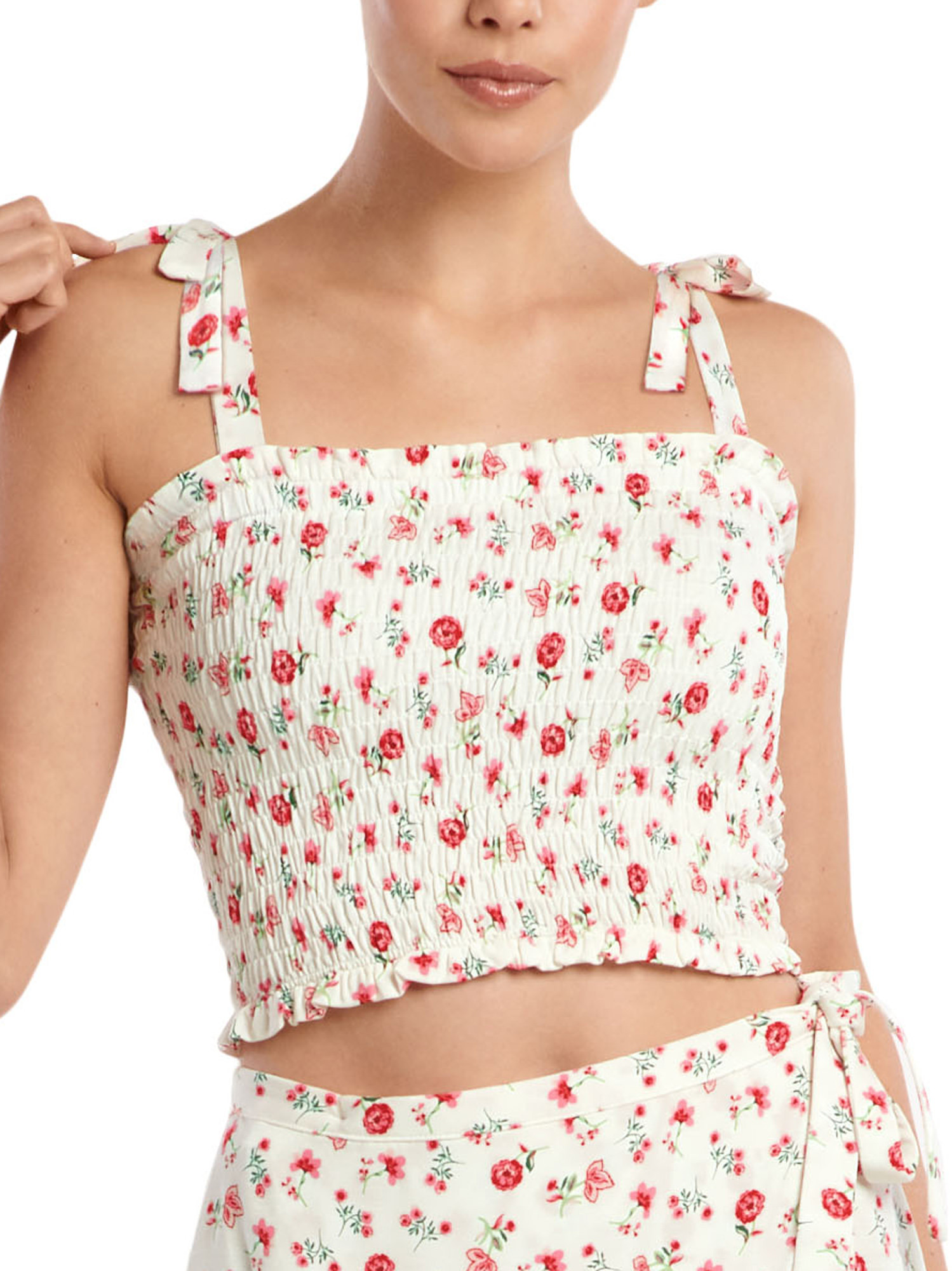 Top smocké court et confortable qui se combine parfaitement avec une jupe ou d'autres vêtements. La couture élastique sur toute la longueur assure un bon ajustement et lui donne un look rétro. Les bretelles sont nouées sur les épaules, ce qui crée un beau détail moderne. Hauteur environ 40 cm.