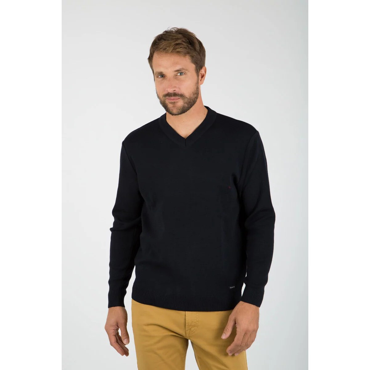 Pièce maîtresse de la garde robe pour un style décontracté et élégant. Pull pour homme Col V Bord-côte en bas de manche et bas de corps Maille en côte 1x1 Hauteur totale pour une taille L : 71 cm Matières : 50% acrylique 50% laine