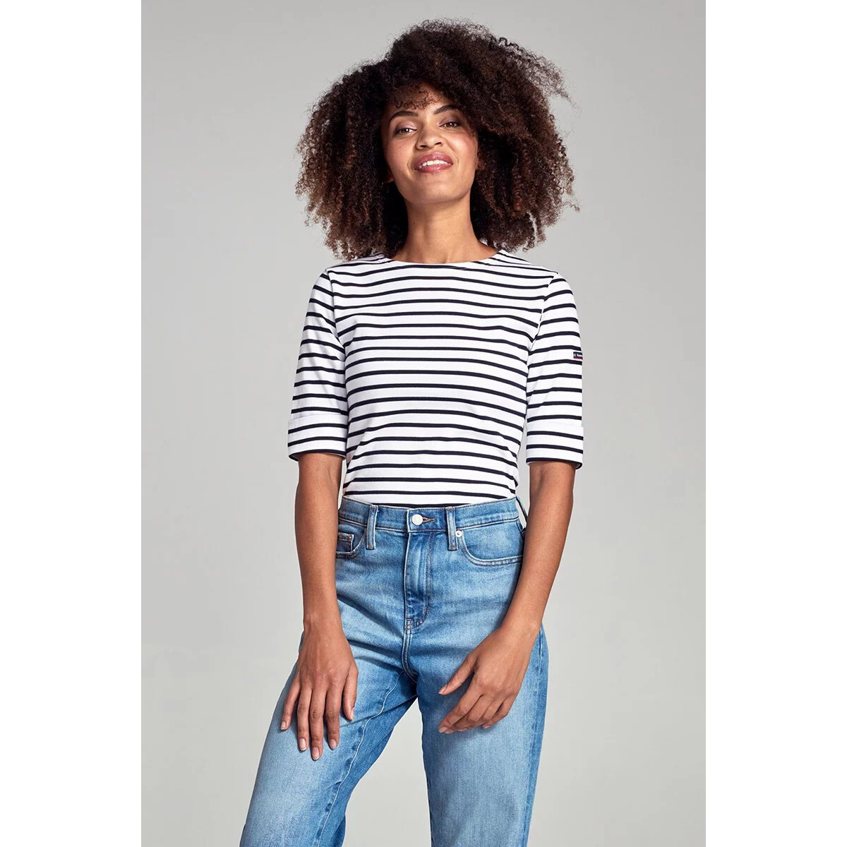 Marinière "Cancale" pour femme Manches 3/4 avec revers aux coudes Col bateau Maille interlock Tricot emblématique d'Armor Lux Matière: 100% coton.
