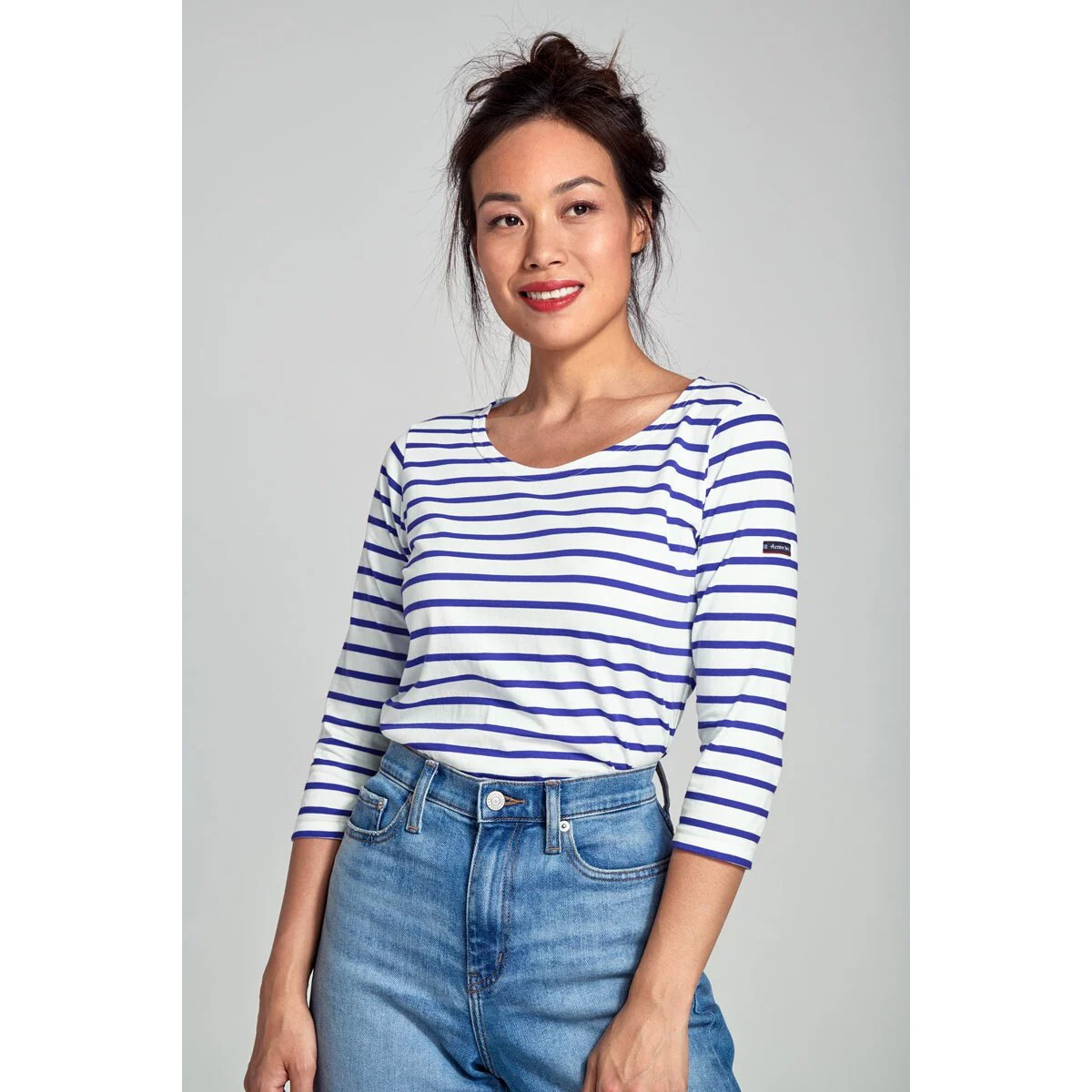 Avec sa maille fine, cette marinière sera parfaite pour les premières chaleurs de l' été. Marinière pour femme Manches 3/4 Col bateau Coupe près du corps Maille en jersey léger Hauteur totale pour une taille 1 : 61 cm Matière : 100% Coton