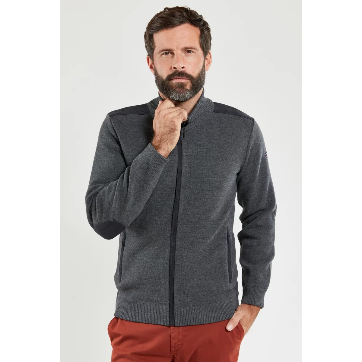 Pièce maîtresse de la garde-robe pour un style décontracté et élégant. Ce cardigan a été tricoté sur des métiers MEC-MOR, qui garantissent une maille de haute densité apportant un toucher et une régularité incomparables. Un savoir-faire d'excellence pour un produit d'exception. Cardigan zippé pour homme Col montant 2 poches sur le devant Double bord-côte en bas de corps et bas de manche Toile suédine aux épaules et aux coudes Hauteur totale pour une taille L : 72 cm Matières : 50% Acrylique 50% Laine