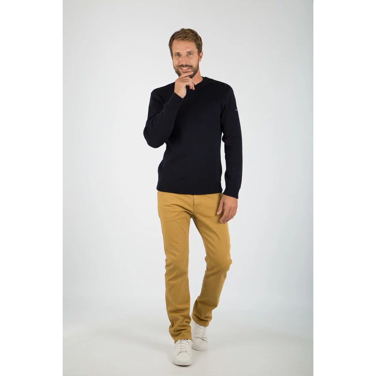 Craquez pour l'authenticité du pull marin, une pièce emblématique qui traverse toujours les saisons avec succès! Pull marin uni pour homme Encolure ronde Patte de boutonnage sur l'épaule gauche Boutons siglés en corozo (ivoire végétal) Double bord-côte en bas de corps et bas de manches Maille en côte 1x1 Hauteur totale pour une taille 4 : 71 cm Matière : 100% laine