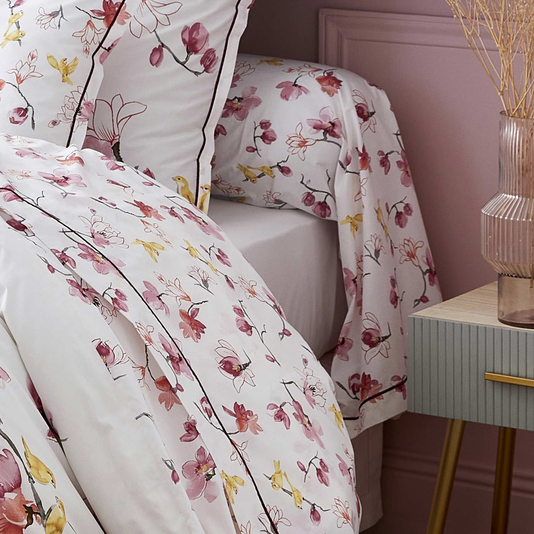 Pour des nuits sereines et des réveils en douceur, optez pour cette taie de traversin fleurie.Imprimée de magnolias par centaines qui donneront à votre décoration intérieure un esprit cosy et cocooning. Les couleurs pastels rose et jaune aquarellées sur un fond blanc appellent à la détente et à la rêverie. Cette taie de traversin est réalisée avec de petits motifs all-over et un bourdon en coloris fuschia.Sa composition est en percale 100% coton, 80 fils/cm² avec un tissage très serré.Lavage en machine à 30°C.Traitement Easy Care pour un repassage très facile.Vendue à l'unité.