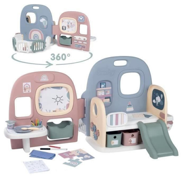Cette creche pour poupons est équipée de 5 espaces de jeux différents : un coin entrée, un coin parc de jeux, un coin toilettes, un coin sieste et un coin repas/créatif. La creche est facile a ranger et a transporter grâce a son mur repliable et a sa poignée. Elle convient aux poupons jusqu'a 42 cm et est fabriquée en France