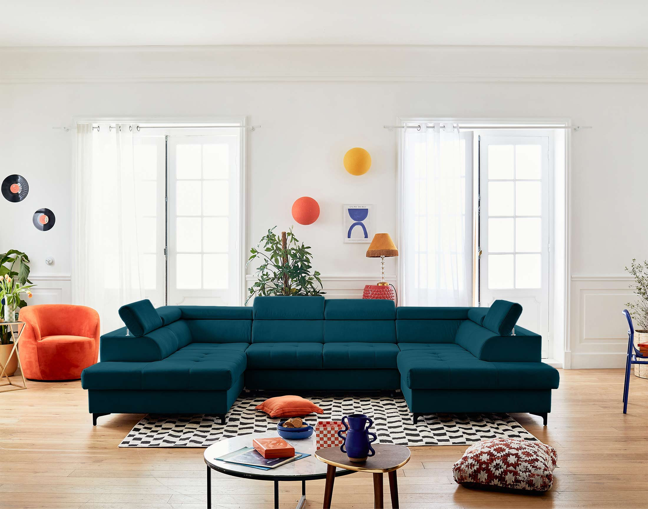 Merida - canapé panoramique en U - 7 places - convertible avec coffres et têtières réglables - en velours
