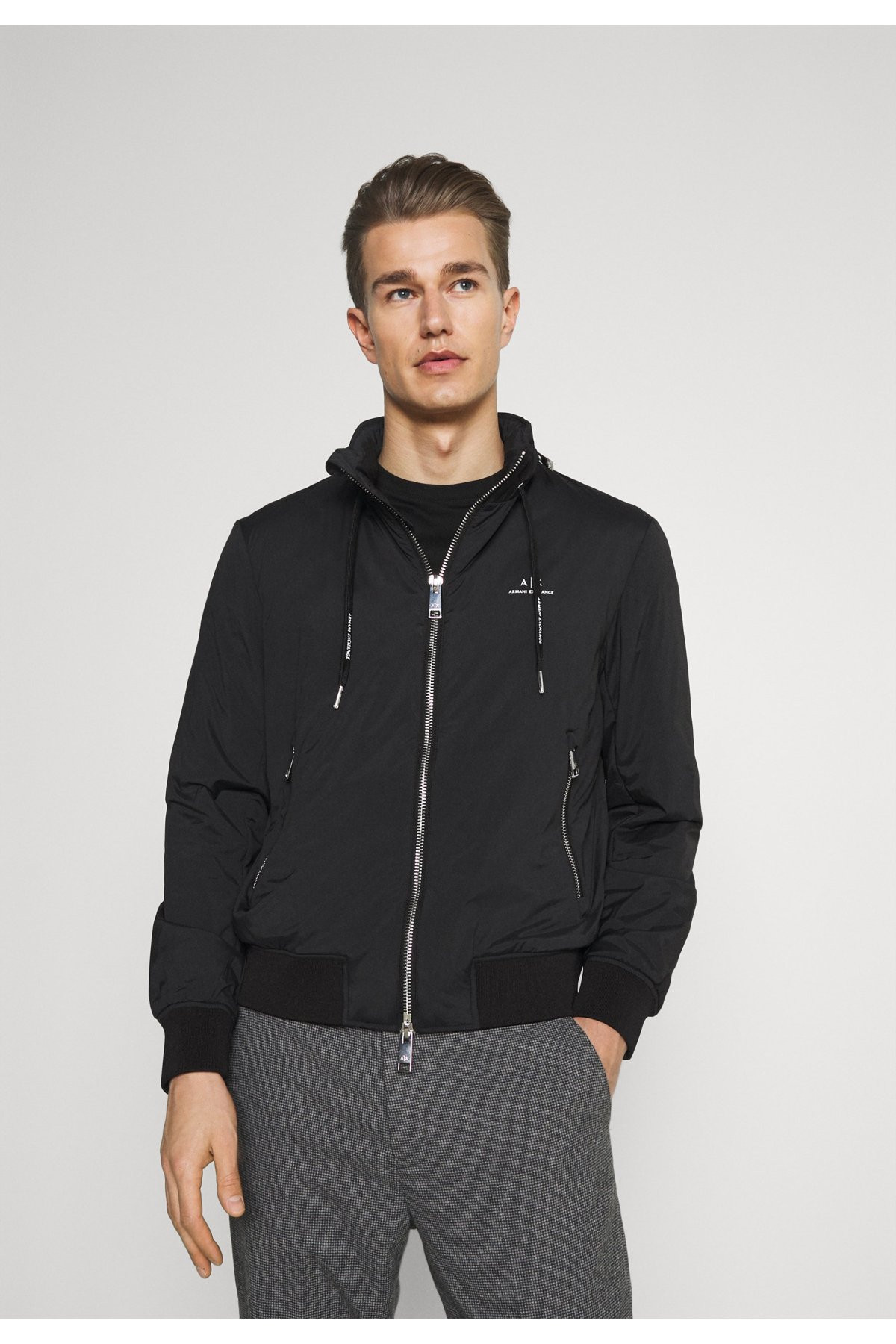 Bomber demi saison - Armani exchange. Coupe: droite. Col: montant, capuche insérée. Matière: 8% Elasthanne, 92% Polyamide. Conseil: prenez votre taille habituelle. Entretien: Lavage en machine. Fermeture: zip. Poche: 2. Logo: imprimé. Tons: les NOIRS.