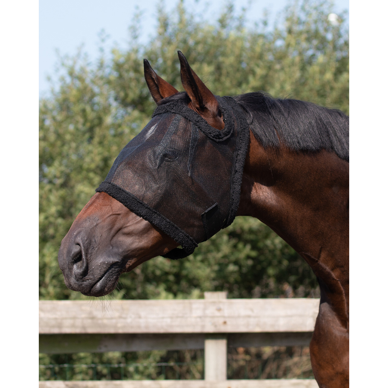 Masque anti-mouches en matériau résistant à mailles fines. Il permet de s'assurer que le cheval n'est pas dérangé par les mouches. Avec doublure douce en laine synthétique sur les bords. Facile à enfiler. Souhaitez-vous connaître la taille à choisir pour votre cheval ? Consultez le tableau des tailles . Matériau du masque : PVC Doublure en matière : imitation de fourrure - Matériau robuste avec forme anatomique pour garder les oreilles dégagées - Matériau à mailles fines - Attachable avec une fermeture auto-agrippante sous la gorge - Doux morceaux de laine synthétique le long des bords  - Lavable en machine à 30 degrés. Fermez la fermeture auto-agrippante et lavez le masque anti-mouches dans un sac à linge. De préférence, n'utilisez pas d'adoucissant et ne séchez pas en machine.