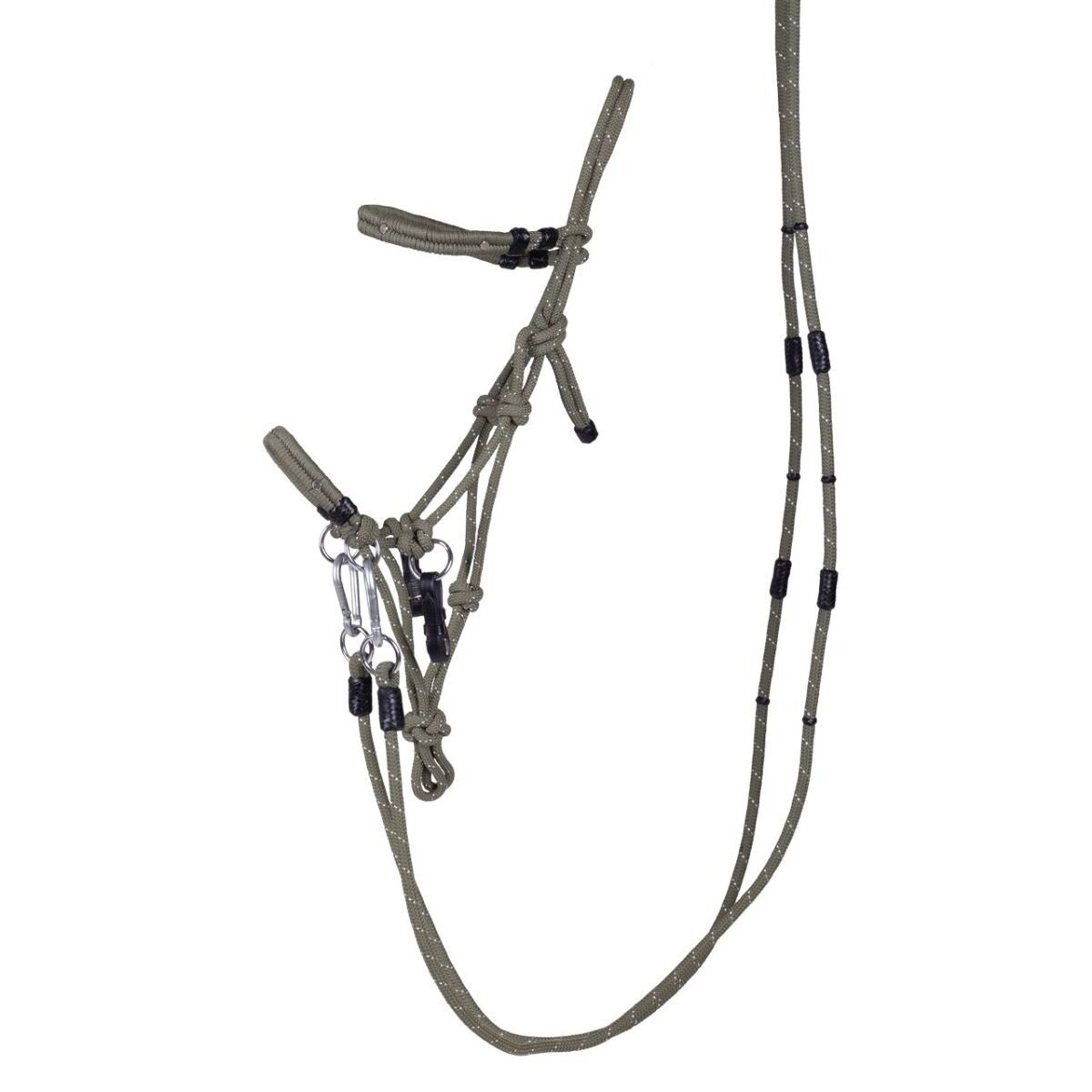 Monter à cheval en licol est la liberté ultime pour vous et votre cheval. Avec cet ensemble multifonctionnel, vous pouvez aller dans toutes les directions. Vous pouvez le monter avec ou sans mors, mais grâce aux rênes et au frontal détachables, vous pouvez également utiliser le licol pour le travail au sol et l'équitation naturelle. Ce licol solide est fait d'une corde épaisse dans laquelle est tissé un fil scintillant. Vous êtes curieux de savoir quelle taille convient le mieux à votre cheval ? Consultez le tableau des tailles. Matériau : polypropylène, cuir Matériel : fer, zinc - Licol multifonctionnel en corde solide - Peut être utilisé comme licol ainsi que comme bridon - Têtière réglable en changeant le nœud - Équipé d'anneaux et de boucles en cuir pour attacher un mors - Équipé de rênes amovibles avec des arrêtoirs antidérapants - Au bout des rênes se trouve un passant mobile pour empêcher le cheval de se prendre les pieds dans des rênes trop longues - Équipé de deux anneaux sur la muserolle et d'un frontal amovible - Comme le licol ne se casse pas, il ne convient pas pour attacher un cheval sans surveillance, pour le transporter ou le mettre au pâturage - Lavable en machine à 30 degrés. Lavez le licol dans un sac à linge. De préférence, n'utilisez pas d'adoucissant et ne le faites pas sécher en machine
