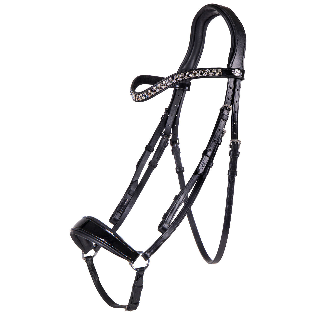 Le bridon Phaedra est un bridon élégant avec une têtière de forme anatomique et une muserolle laquée basse. La muserolle passe sous le mors et assure donc une position plus stable du mors dans la bouche. Le frontal a un look chic en raison de la finition avec du cuir verni et des strass dans les couleurs argent, gris et noir. Spécifications - Matériau : cuir - Matériau mercerie : acier inoxydable - Bridon avec têtière de forme anatomique - Une muserolle basse assure une position stable du mors - La têtière et la muserolle sont pourvues d'un rembourrage doux - Equipée d'un frontal de couleur argent/gris/noir - Fourni avec des rênes assortie