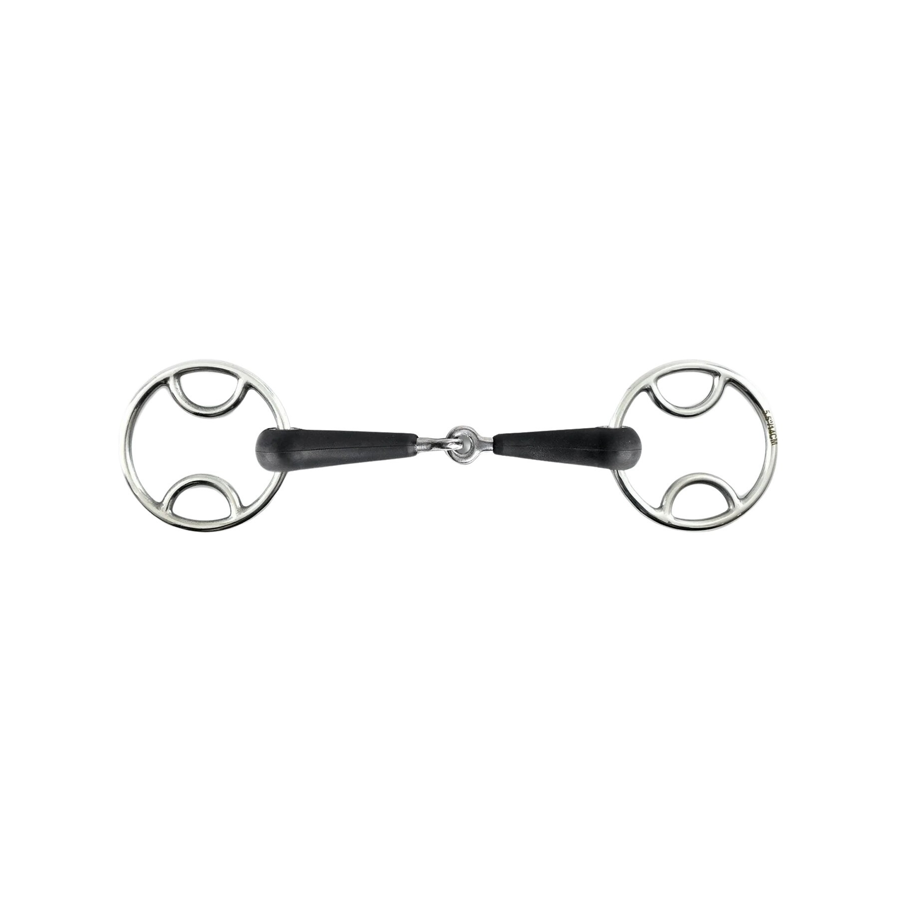 Le mors Bevel est un filet modifié à anneau lâche qui permet au cavalier d'appliquer un degré intermédiaire d'effet de levier et peut également contribuer à promouvoir une silhouette correcte. L'embouchure en caoutchouc durable à articulation unique offre un niveau de confort plus élevé dans la bouche du cheval tout en exerçant une pression sur les barres, les lèvres et les côtés de la langue. Semblable à un gag à trois anneaux ou hollandais, mais avec moins d'effet de levier, ce qui en fait un mors idéal pour les chevaux qui ont besoin de plus de puissance de freinage qu'un filet normal. L'embouchure en caoutchouc rend le mors plus chaud et donc plus facilement accepté par les chevaux sensibles. Mesures Selon notre guide des tailles, les mesures A et B de ce mors sont les suivantes : 4.5" & 5" - A=15mm & B=55mm 5.5" - A=15mm & B=65mmMors de cheval en caoutchouc... Les mors recouverts de caoutchouc ont généralement des embouchures plus épaisses, ce qui les rend plus souples et idéaux pour les chevaux aux bouches sensibles ou ceux qui n'aiment pas les mors en métal. Nos mors en caoutchouc ont été traités thermiquement pour les rendre plus doux au toucher et plus durables. En raison de leur embouchure plus épaisse, ils peuvent ne pas convenir aux chevaux ayant une petite bouche ou une grande langue.Associez votre mors à l'une de nos brides anatomiques. Pour des raisons de santé et d'hygiène, ce mors ne peut être retourné s'il est retiré du modèle. Détails techniques - Mors à anneau libre avec positions de rênes fixes - Embouchure en caoutchouc durable à articulation unique - Deux options de levier - attacher les rênes à l'anneau du milieu pour une action douce ou au point fixe en bas pour plus de levier - Les anneaux du mors sont plus larges sur les modèles 5" et 5,5" afin que le mors reste proportionné à la tête du cheval. - Ce mors n'est pas autorisé par le BD - Force du mors : Intermédiaire Instructions d'entretien Pour promouvoir une bonne hygiène et protéger la longévité de votre mors de cheval, nous recommandons le régime d'entretien suivant après chaque utilisation. 1. Rincez votre mors après chaque utilisation sous un robinet pour enlever toute salive ou débris sur la surface.2. Utilisez une éponge ou un chiffon doux pour essuyer tout excès de débris sur le mors, en accordant une attention particulière aux joints et aux charnières. 3. Laissez sécher naturellement.