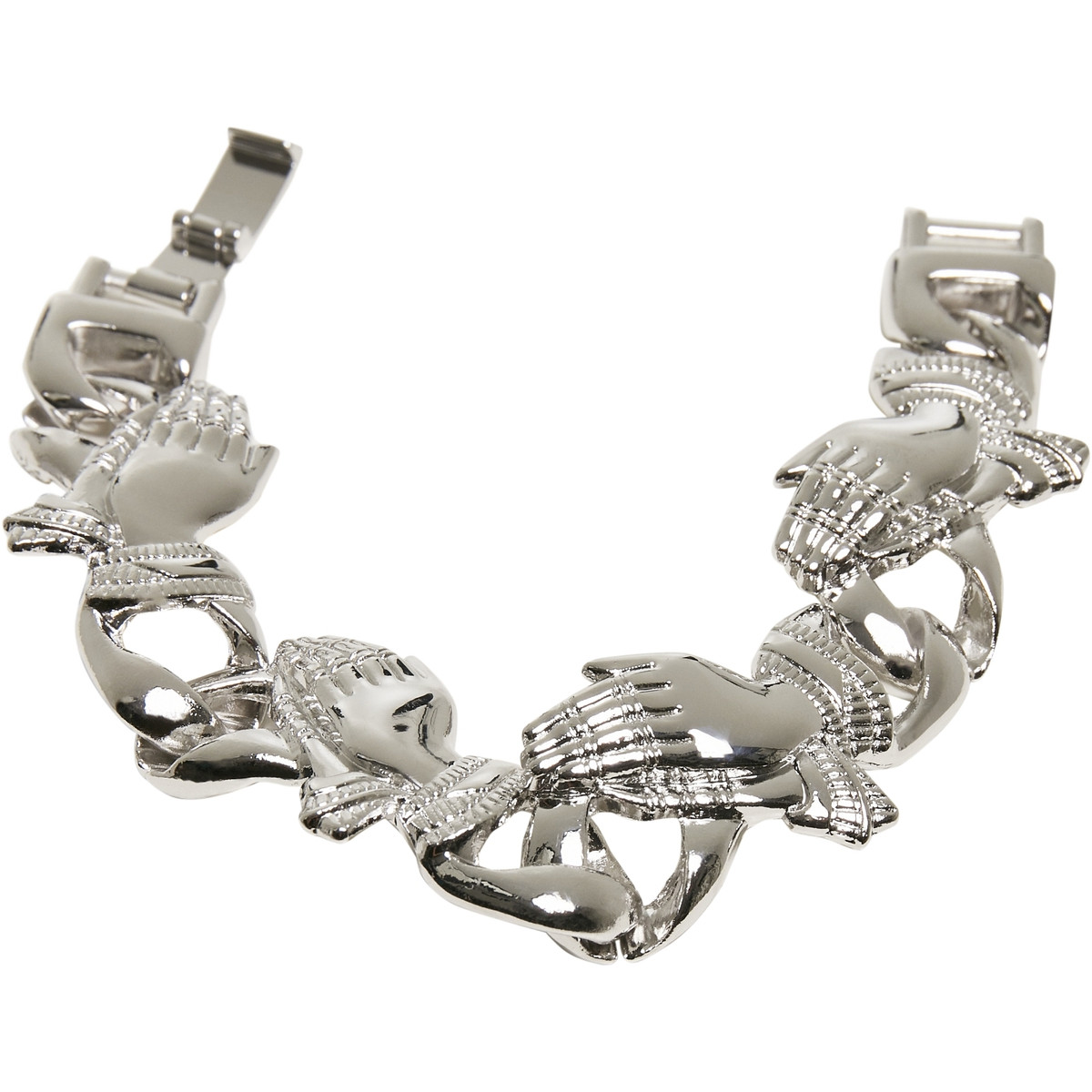 Ce bracelet Urban Classics est un véritable accroche-regard. Avec ses grands maillons, il attire l'attention, car certains maillons ont la forme de mains de prières. Le bracelet remarquable est fabriqué en alliage stable et se ferme à l'aide d'une boucle.Oberstoff 1 : 100% Zinklegierung