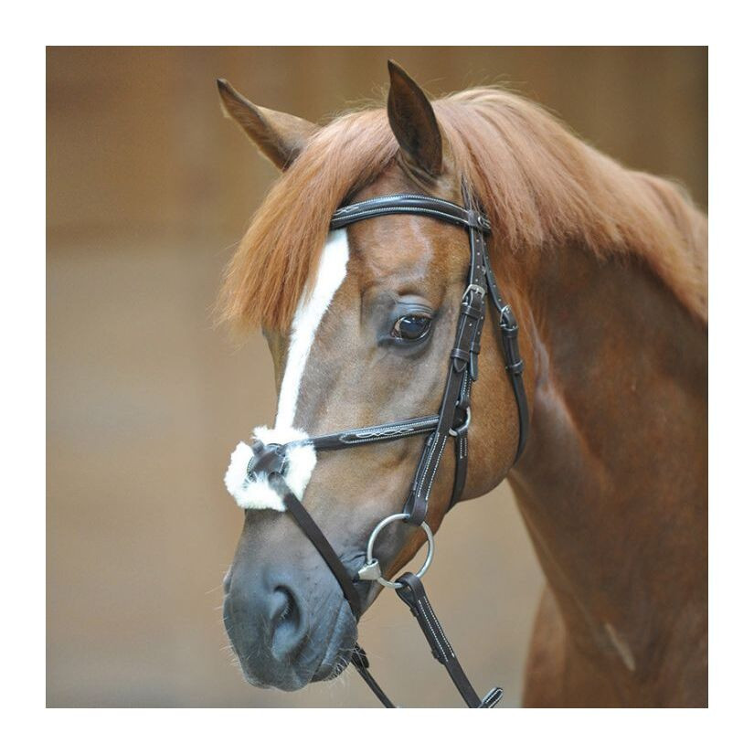muserolle mexicaine, réglable des deux côtés- muserolles rondes interchangeables en cuir d'agneau- avec rênes caoutchoutées avec crêtes d'arrêt- têtière anatomique, rembourrée- crochets à goujon pour fixer le mors- coutures de couleur claire- frontal en cuir incurvé avec broderie décorativeTaille : PII, Cob, FullCouleur : noir, marronRaccords : argentMatière : cuir, agneauPoids : 0,8 kg