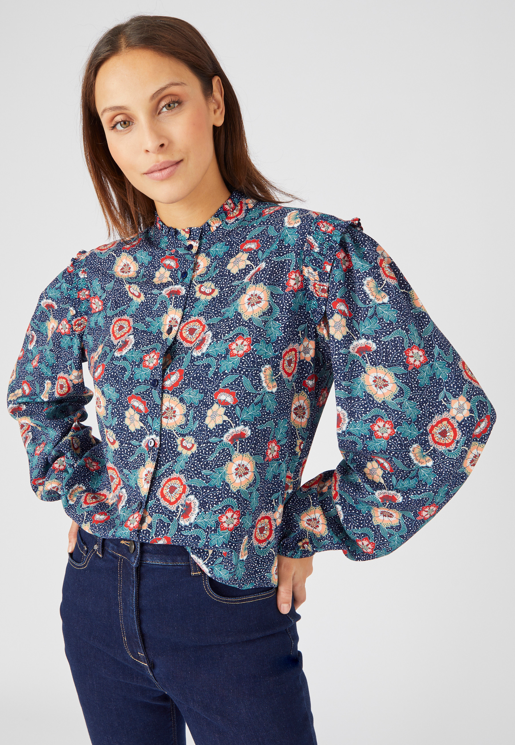 Un chemisier qui collectionne les bons détails sur un tissu pure viscose Lenzing(TM) EcoVero(TM), moins gourmande en eau qu'une viscose classique. Souple, douce, légère, c'est l'une des matières favorites en été. Vous tomberez sous le charme de son volant placé au col rond qui souligne délicatement le cou et vous raffolerez de ses smocks volantés placés sur le haut des épaules. Des fantaisie qui font tout ! Ses manches longues avec fronces en tête de manches et bas élastiqués donnent un effet bouffant des plus actuels. On le twiste à un jean flare pour un look au top. Parfait également avec un pantacourt pour un look estival des plus remarqués. Col rond. Patte de boutonnage pour une bonne tenue. Longueur du chemisier imprimé femme 64 cm environ.