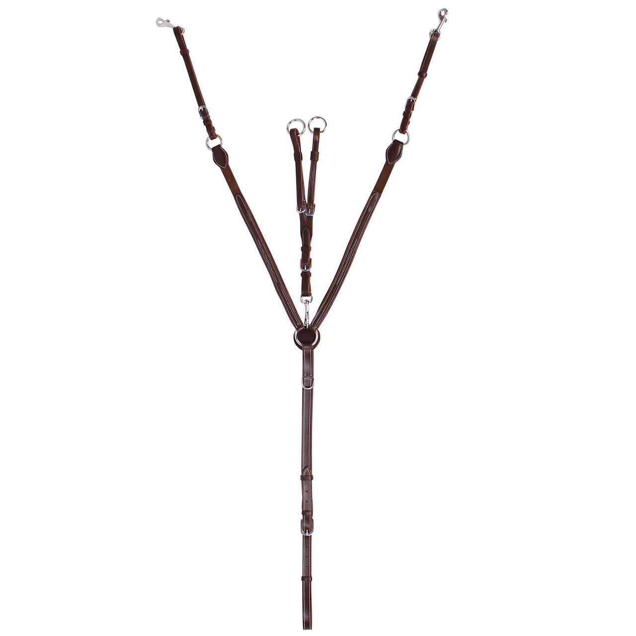 Collier de chasse en cuir de grande qualité avec martingale et fini avec des sûrpiqures blanches. Composition: Cuir - Assortie avec les bridons luxe Surpiqûres articles n° 2021 et 2024 - Martingale amovible - Réglable en six positions (aux extrémités de la selle, à la sangle et à la martingale) - Bouclerie en acier inoxydable de couleur argent